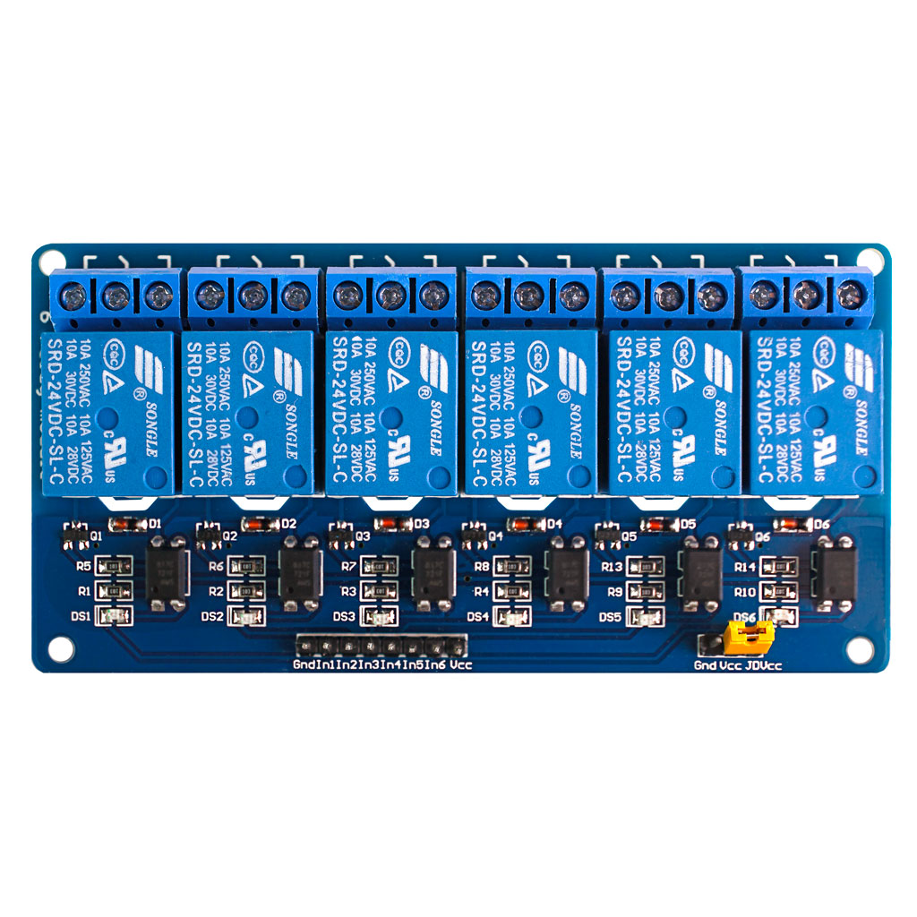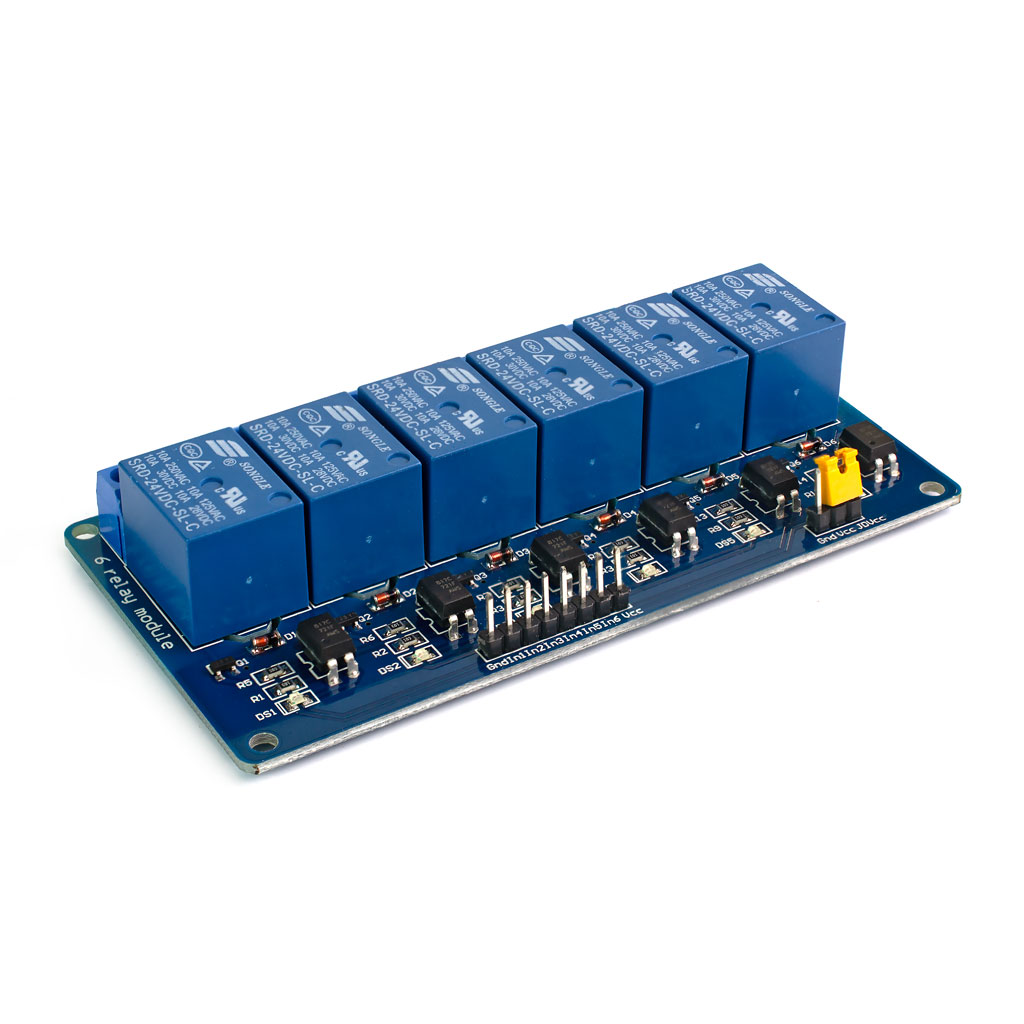 Модуль реле на 6 каналов с опторазвязкой. Обеспечивает более защищенное управление нагрузкой. Питание 24 В.