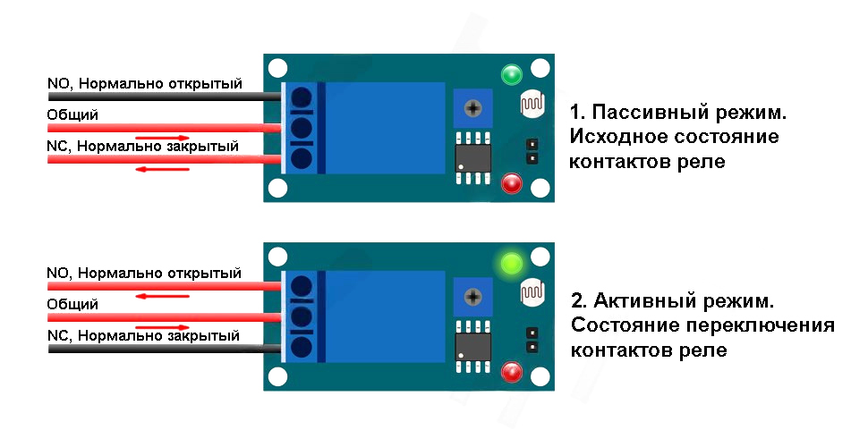 Реле с датчиком света XH-M131 оснащён двумя цветными светодиодными индкаторами. Свечение красного индикатора указывает на наличие питающего напряжения в цепях модуля. Зелёный индикатор символизирует включение реле в активное состояние.