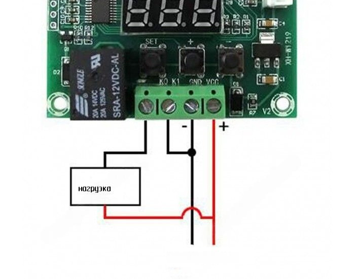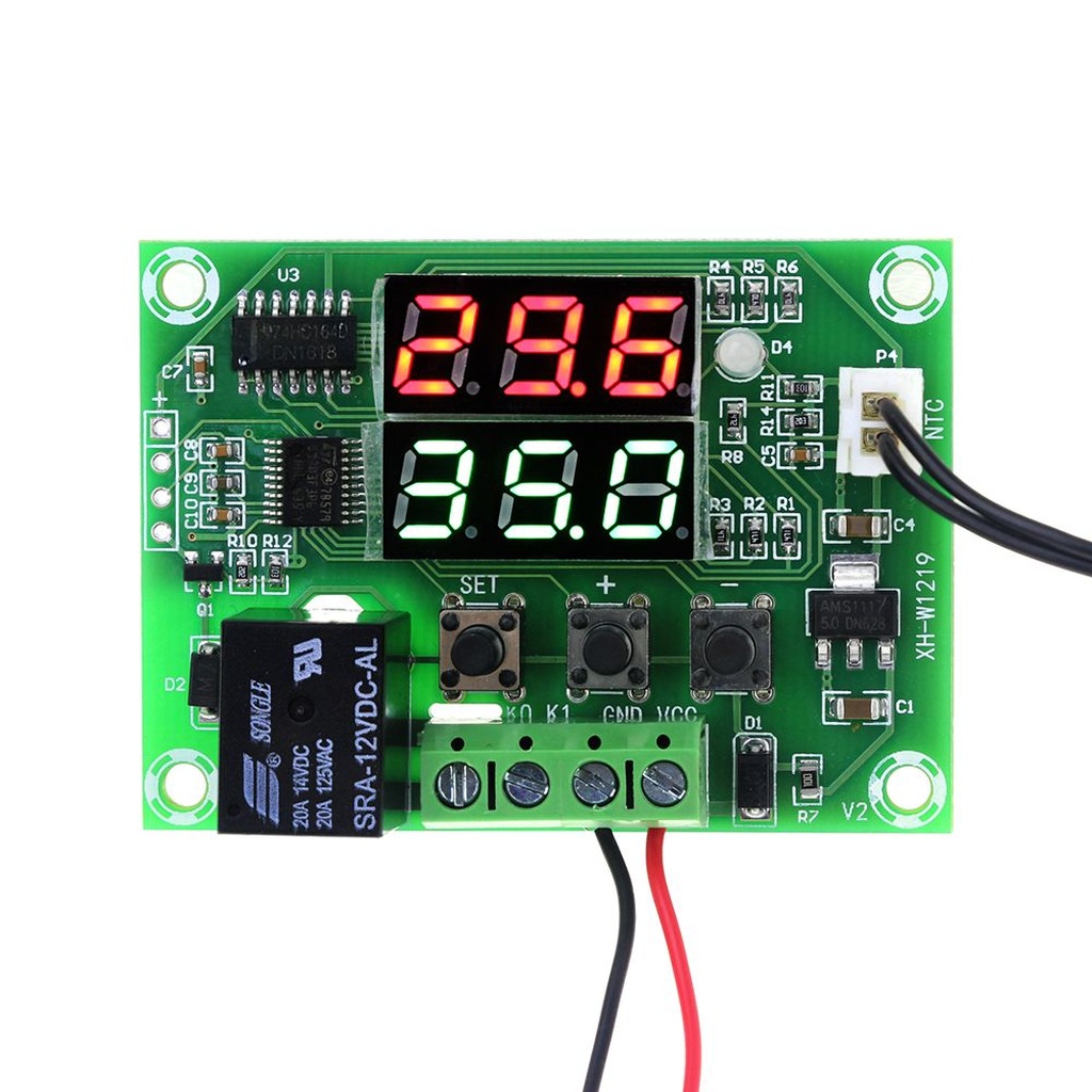 Программируемый цифровой термостат XH-W1219 предназначен для контроля температуры в диапазоне от -50 до +110°C, имеет два семисегментных светодиодных индикатора, светодиодный индикатор включения реле, три кнопки управления электронным терморегулятором, разъем для подключения внешнего термодатчика, клеммы «К0/К1» для подключения нагрузки и «VCC(+)/GND(-)» для питания платы терморегулятора. На верхнем дисплее отображается текущая измеряемая температура с датчика, на нижнем температура включения или отключения реле.