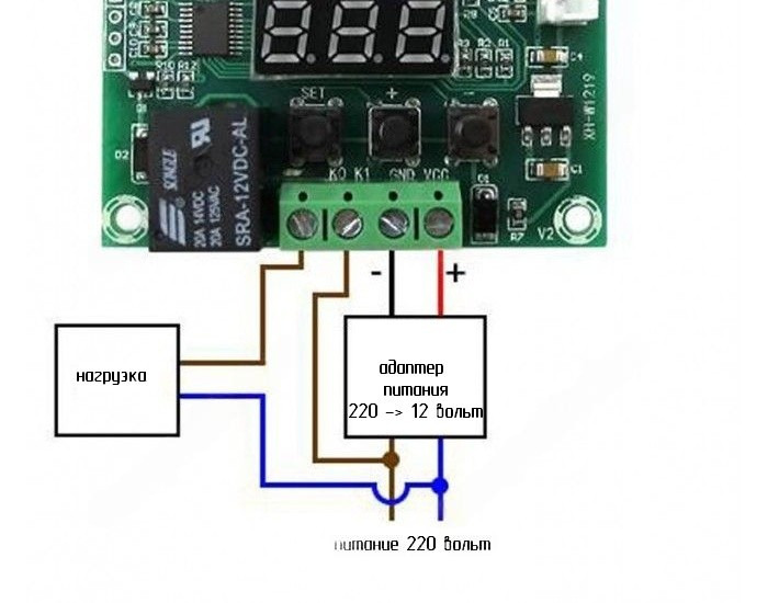 Подключение нагрузки к бытовой сети переменного тока. Для питания таймера необходим адаптер 220VAC-12VCD.