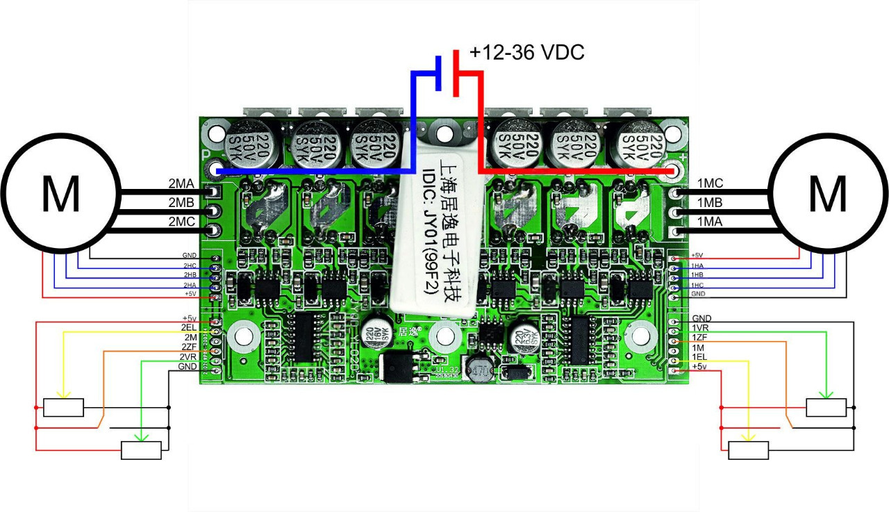 Модуль двухканального драйвера JYQD-YL01(99F2) с ручным/программным управлением для 1-2 бесщёточных BLDC моторов с обратной связью (3-мя встроенными датчиками Холла). Подходит для использования в конструкциях персонального автотранспорта на электромеханической тяге (например, в самобалансных гироскутерах), роботизированных передвижных платформах, и др. Драйвер поддерживает ручное или программное управление, имеет функции регулировки скорости вращения мотора, выбор направления вращения с быстрым переключением (без ожидания полной остановки), регулировки силы торможения мотора, обратной связи. Ключевое отличие от версии JYQD-YL01(8559) — предусмотрена защита с автоматическим отключением подачи энергии на бесщёточный мотор в случаях принудительной блокировки его вращения.