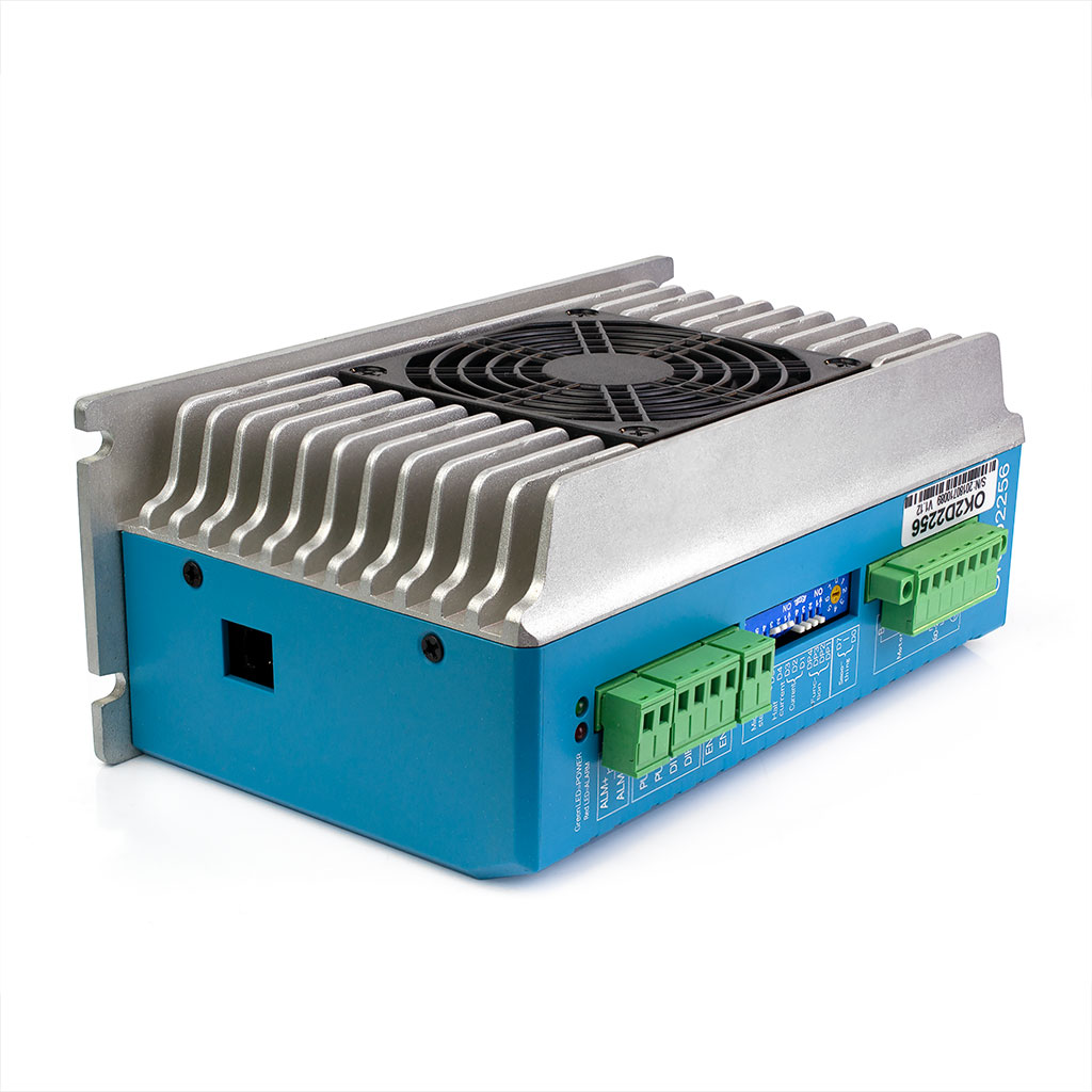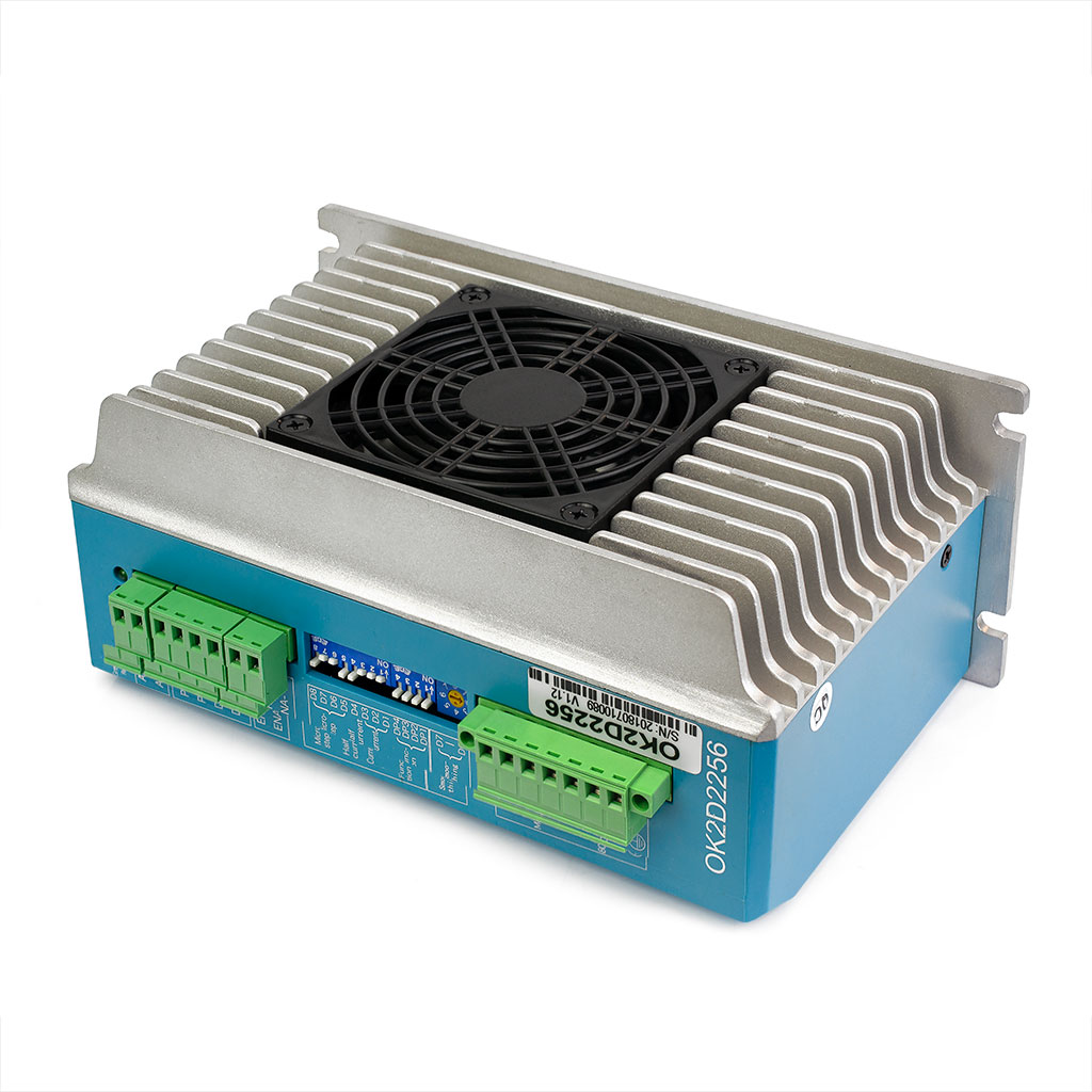 Драйвер двухфазного шагового двигателя OK2D2256, аналог (2M2260). Питание логики: 5В/12В/24В. Напряжение моторов 80-220В AC. Рабочий ток 1.3-5.6А. Частота пульсации 200кГц, Частота ШИМ: 20кГц. Имеет гальваническую развязку параллельного интерфейса, активное охлаждение и ручную настройку микрошага 1-64. Интерфейс: RS232 для настройки и управления. Совместим с моторами Nema23, 34, 43, 51. Встроена защита от сверхтоков (более 6А), высокого и низкого напряжения. Размеры: 193х122х78мм. Вес: 1050гр.