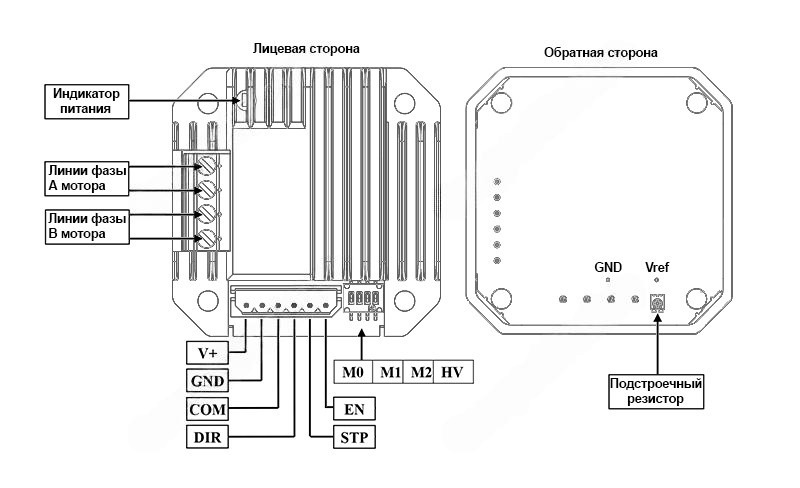 Контакты управляющих сигналов DIR, STP, EN обладают внутренней гальванической развязкой через оптроны. Они увеличивают степень общей электробезопасности цепей управления, защищают электронные компоненты драйвера от вероятных повреждений, связанных с нестабильностью логического напряжения или наличия токов КЗ.