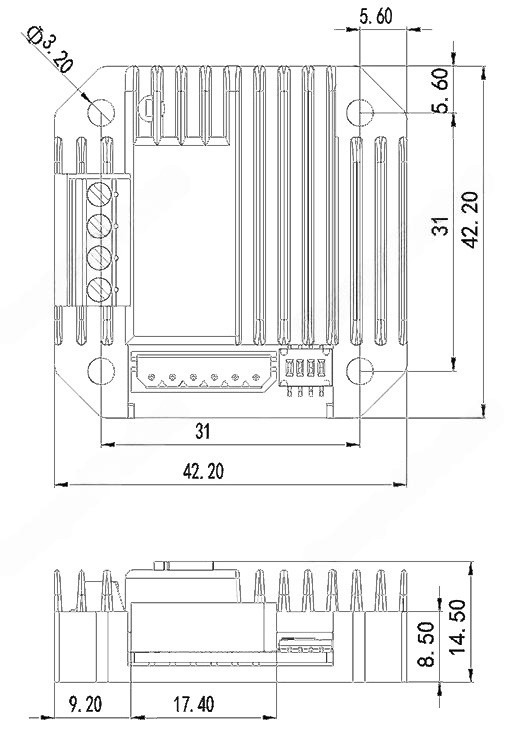Модель драйвера 7TPSM4220 отличается от большинства подобных устройств своим конструктивным исполнением. Формат изделия предлагает возможность установки драйвера непосредственно на основание шагового мотора. Габариты корпуса по длине и ширине приравнены к стандартным для Nema17 размерам - 42 х 42мм. Для надежной фиксации двигателя с контроллером достаточно воспользоваться четырьмя обычными болтами диаметром 3мм. Контроллер оснащён пассивным охлаждением, рассеивающим выделяемое тепло в окружающую среду. Корпус конструкции изготовлен из цельнометаллического алюминиевого сплава. В случаях повышающегося нагрева, на решётку радиатора допускается самостоятельная установка дополнительного вентилятора.