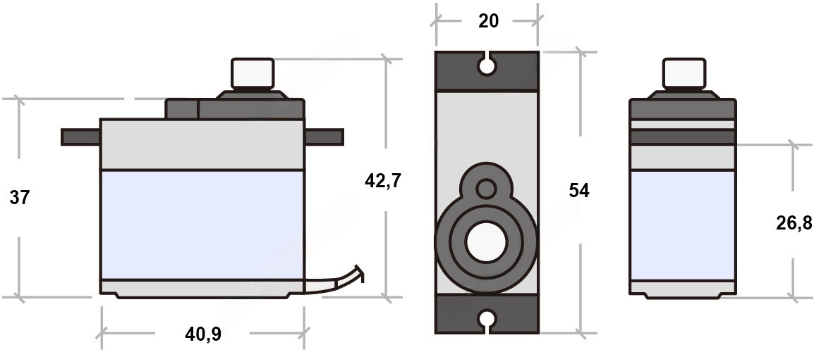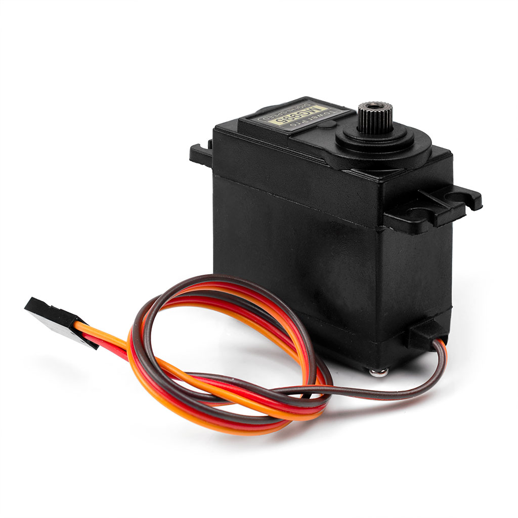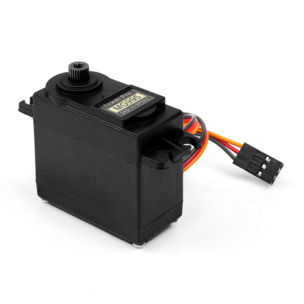 Сервопривод MG995 угол поворота 180°, момент 8,5-10кг*см, вес - 55 гр, размеры - 40.7*19.7*42.9 мм, питание - 4.8/6.6 В, длинна кабеля - 31 см, шecтepёнки - латунь, подшипники - 2 шт. Логика - аналоговая на МК АА51880.