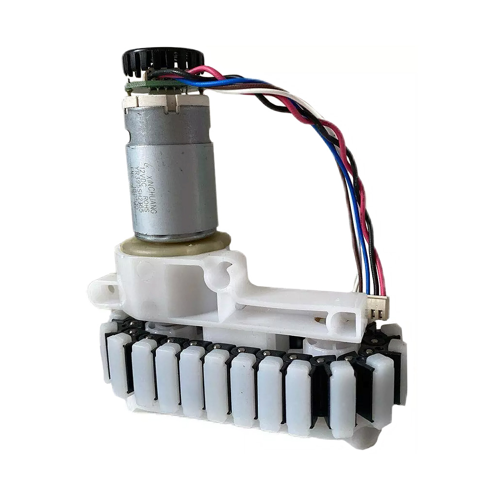 Сконструируйте свою модель интеллектуального робота-вездехода, самоходной танковой машины или бульдозера, используя этот мощный гусеничный привод, изготовленный из мотора-редуктора YR395HS2365. Привод обладает полезной грузоподъёмностью до 5кг. Научите вашего робота самостоятельно контролировать скорость и направление движения, выполняя измерения пройденного расстояния с помощью встроенного оптического энкодера обратной связи. Без нагрузки и при номинальном напряжении 12В постоянного тока, скорость передвижения привода может достигать 110~120мм за 1 секунду. В схему питания DC-мотора интегрированы два LC-фильтра сглаживания напряжения, по одному на плюсовую и минусовую линии. Штатный 5-вольтовый ИК-энкодер устроен из оптрона щелевого типа и в паре со светопрерывающим диском, генерирущего 20 импульсов на один полный оборот вала DC мотора. В конструкции гусеничного трака использован противоскользящий износостойкий силиконовый резиноподобный материал, обеспечивающий повышенную устойчивость на различных поверхностях или грунтах. Для крепления к подвеске шасси предусмотрено 5 отверстий с диаметром 4мм.