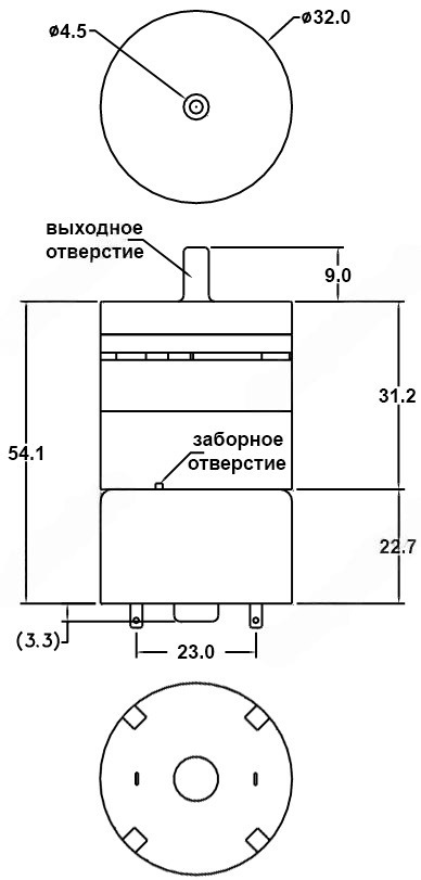 Мотор с диафрагменной воздушной помпой KPM32B. Питание 24В, ток 80-120мА. Воздушный поток без нагрузки: 3-3,5 литра/минуту. Макс.давление 53,3 кПа. Шум менее 65 дБл. Размеры: 32х32х50,2мм.