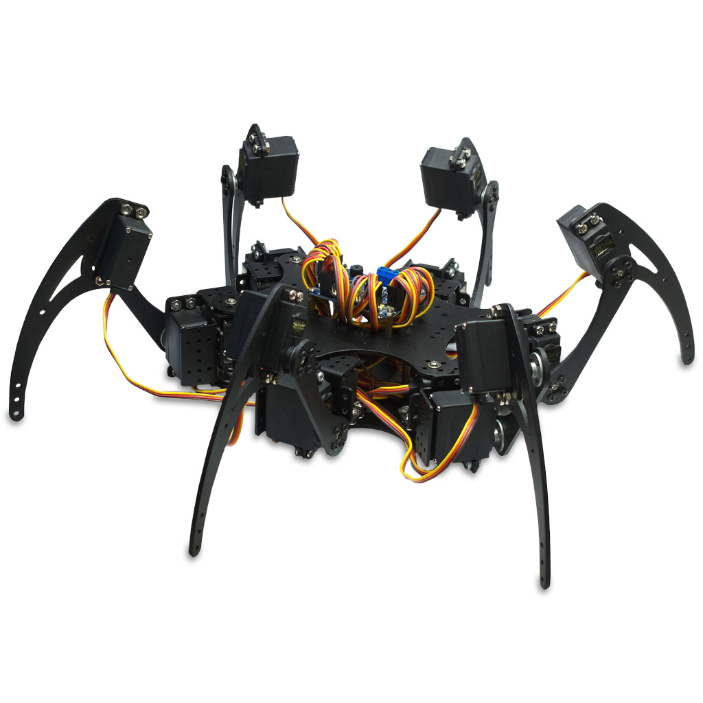 Роботизированное шасси 18DOF Hexapod Robot для заинтересованных в конструировании и программировании более совершенных и интересных роботов, нежели распространённые разновидности колёсных машин на радиоуправлении. Эта мобильная платформа в формате шестиногого робота-паука средних размеров изготовлена из прочного, 3-миллиметрового алюминиевого сплава и окрашена в чёрный цвет. Робот гексапод с 6-ю точками опоры отличается хорошими характеристиками устойчивости и проходимости. Он использует механику ходьбы, аналогичную настоящему насекомому - пауку. Конструкция робота оснащена 18-ю мощными сервомоторами MG995, которые позволяют ему свободно перемещаться в любом направлении и с любой скоростью, как по ровным участкам местности, так и по лёгкому бездорожью. А также обеспечивают роботу способность разворота на одном месте, вертикального восхождения под малыми углами и иных действий.