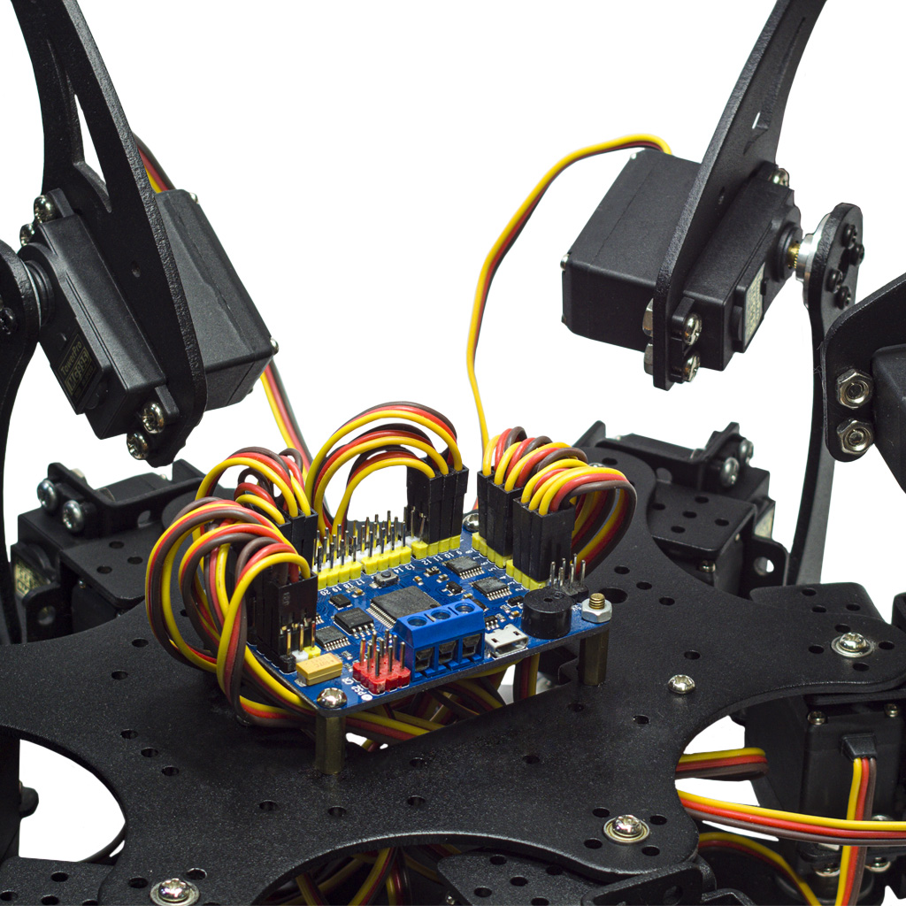 Шагающая модель робота-паука поставляется с платой серво-контроллера RTRobot 32ch Servo Controller, на которой рамзещены 32-разрядный чип семейства ARM со встроенной памятью 16МБ и 32 порта подключения цифровых сервомоторов. Интегрированная память позволяет хранить запрограммированные наборы инструкций, соответствующие тому или иному движению робота. Универсальным модулем серво-драйвера поддерживается три разных способа управления робом. В автономном варианте, набор инструкций выполняется серво-контроллером из встроенной памяти. В автоматизированном варианте, набор инструкций поступает в серво-контроллер через последовательное проводное подключение (внешний контроллер Arduino, STM, Raspberry Pi или иное устройство с шиной UART). В третьем варианте, набор инструкций передаётся средствами беспроводной связи с добавлением сетевых модулей приёма радиосигналов Wi-Fi/BT (с шиной UART). Кроме того, реализова ещё один вариант дистанционного управления на расстоянии до 10 метров, с помощью специализированной версии беспроводного джойстика PS2, функционирующего на частоте 2.4ГГц.