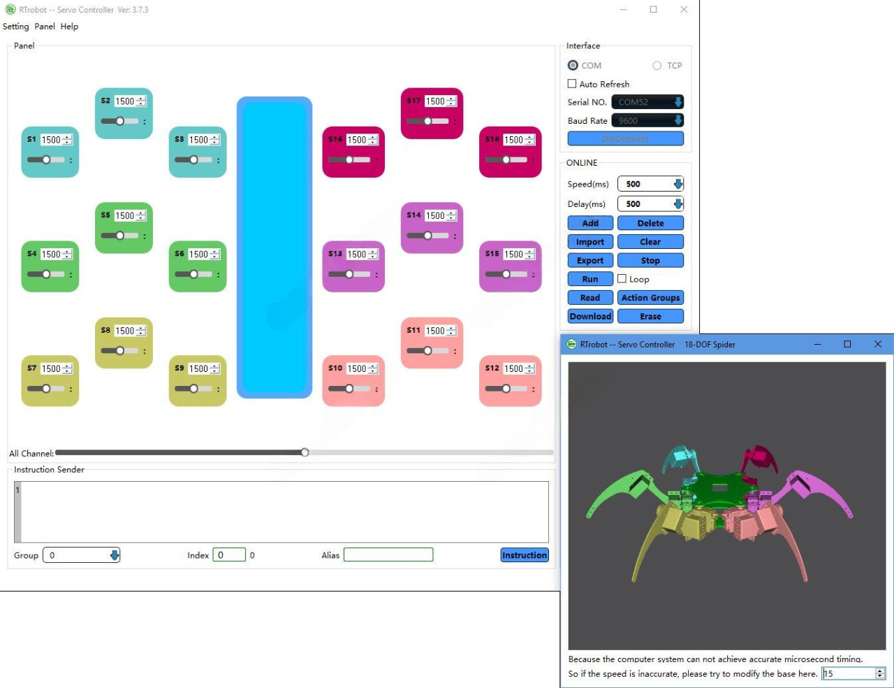 Вид окна настроек и программирования серво-контроллера приложения RTRobot Servo Controller вместе с окном 3Д-визуализации
