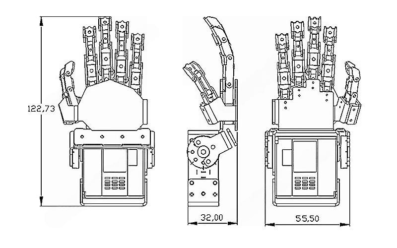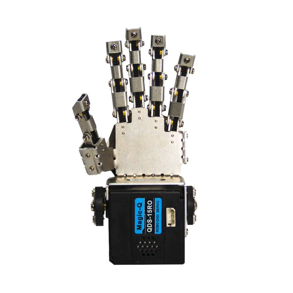 В качестве тягового привода используется сервопривод Magic-Q QDS-15RO — модель средней мощности, с полностью металлическим редуктором. По динамическим характеристикам QDS-15RO практически аналогичен MG995/MG996. Серво мотор QDS-15RO функционирует от напряжения 6-8.4 вольт, потребляет ток от 100 до 1500мА (прямо зависит от физической нагрузки). Питание серво желательно организовать от совместимого внешнего источника электроэнергии. Исходное положение пальцев руки регулируется винтовыми зажимами на кронштейне, установленного на ведущей вал QDS-15RO.
