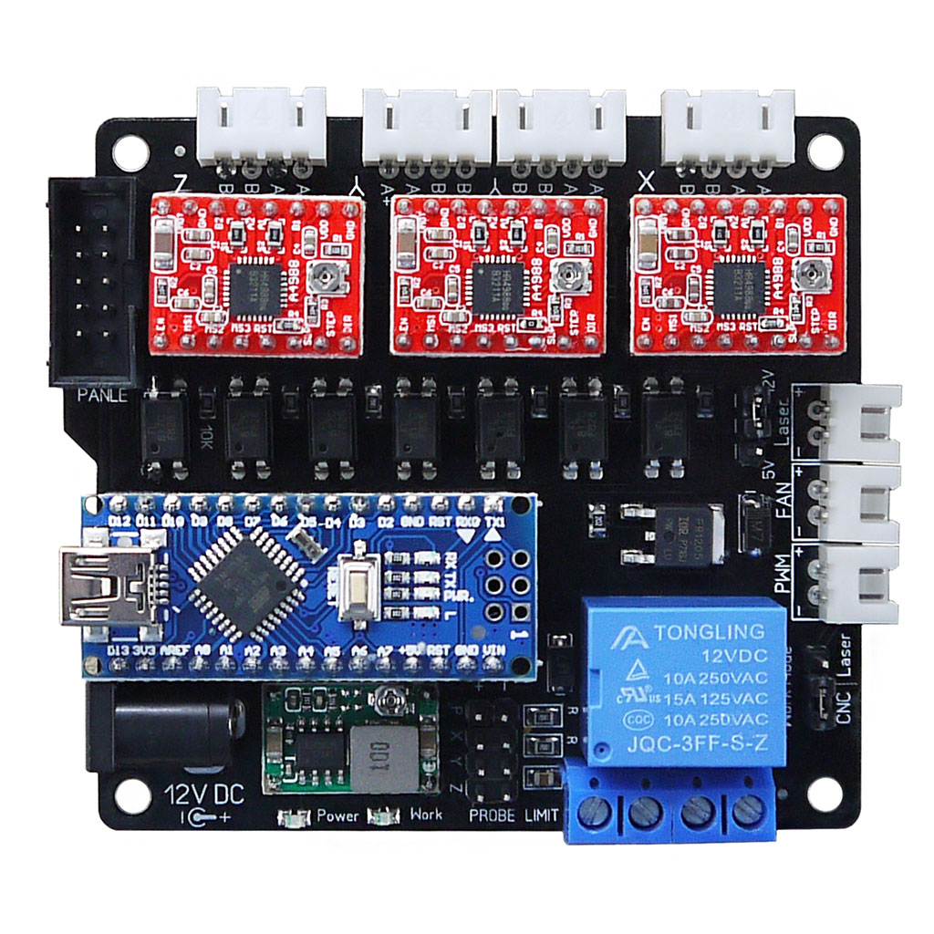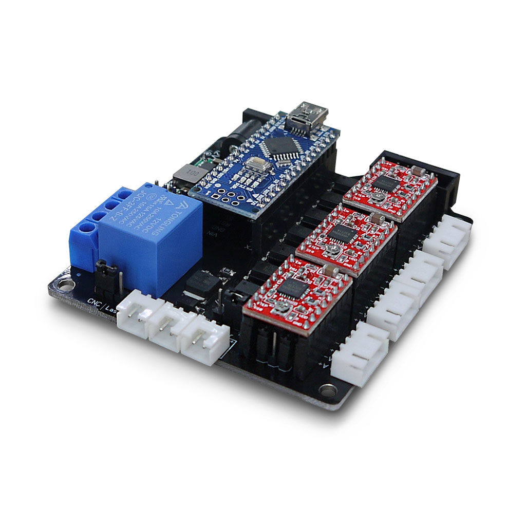 Плата управления рассчитана для работы с трех осевыми фрезерными станками (большее количество осей не поддерживает прошивка GRBL) и имеет три драйвера шаговых мотора. Для построения 3D принтеров данная плата не пригодна по причине малой вычислительной способности arduino nano и отсутствию дополнительного драйвера шагового двигателя экструдера. Выводы оси Y сдублированы, то есть предусмотрена возможность подключения двух шаговых двигателей, но управление обоими двигателями осуществляется через один драйвер.