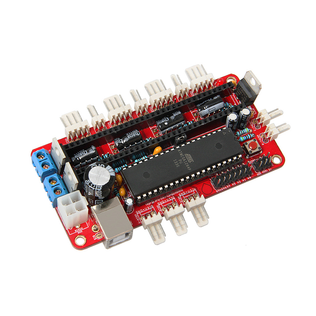 Универсальная плата Sanguinololu v1.3a предназначена для самостоятельной сборки 3Д-принтеров или ЧПУ-станков различных моделей и конструкций с 1-4 направляющими осями. Sanguinololu v1.3a основана на программируемых чипах Atmega 644P, Atmega 1284 или Atmega 1284P. Она обладает полным набором необходимых функций, имеет совместимость с ШД-драйверами A4988 и DRV8825, а также работает со всеми биполярными шаговыми двигателями с соответствующими параметрами энергопотребления. Поддерживаются функции обратной связи с датчиками температуры - термисторами для нагревателя экструдера и нагревочного стола. Реализована возможность настройки коэффициента дробления шага для каждого ШД от 1/1 до 1/16 или 1/32 (в зависимости от модели драйвера). Плата Sanguinololu v1.3a может быть дополнительно расширена модулем считывателя карты формата SD/microSD, дисплейным модулем LCD 2004 или другим оборудованием через специализированный разъём, на котором выведены пользовательские интерфейсы UART, I2C, SPI и ADC.