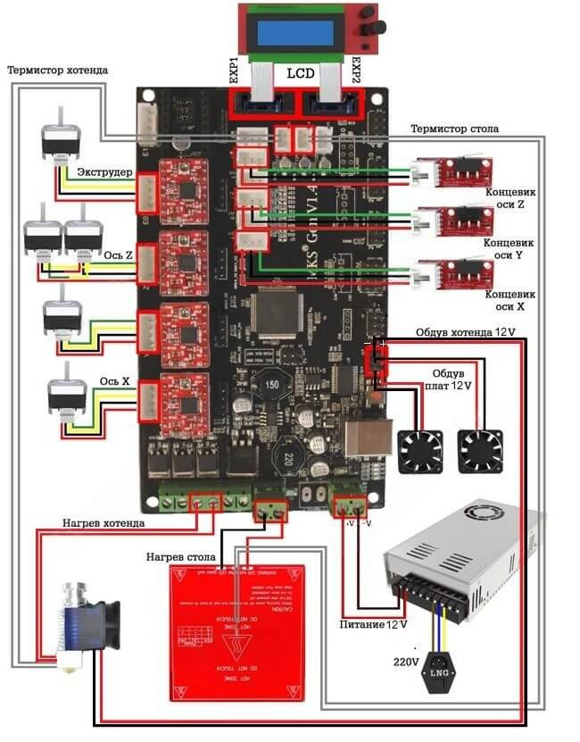 Отдельно стоит отметить, что приведена схема подключения с 12 вольтовым блоком питания и одним экструдером, в то же время плату управления можно использовать с блоком питания на 24 вольта, что ускорит нагрев печатного стола и хотенда, что в свою очередь позволит подключать хотенды "вулкан".