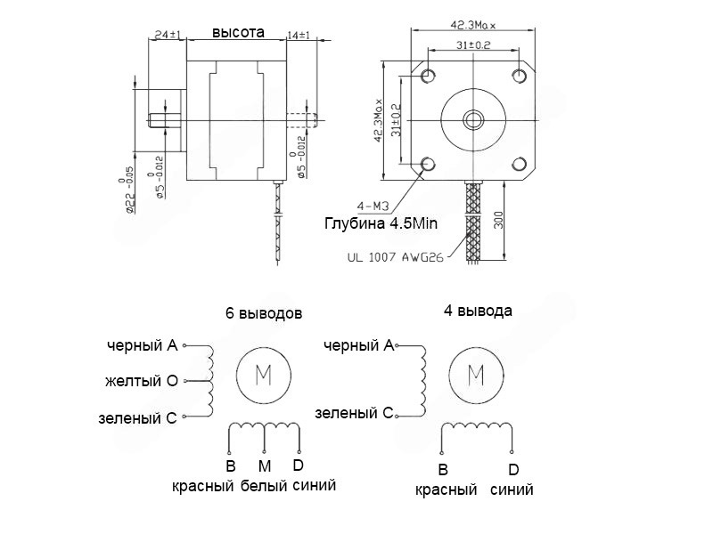 Мотор шаговый Nema 17 (OK42STH38-0806B) четырехфазный, униполярный, 6ти проводной