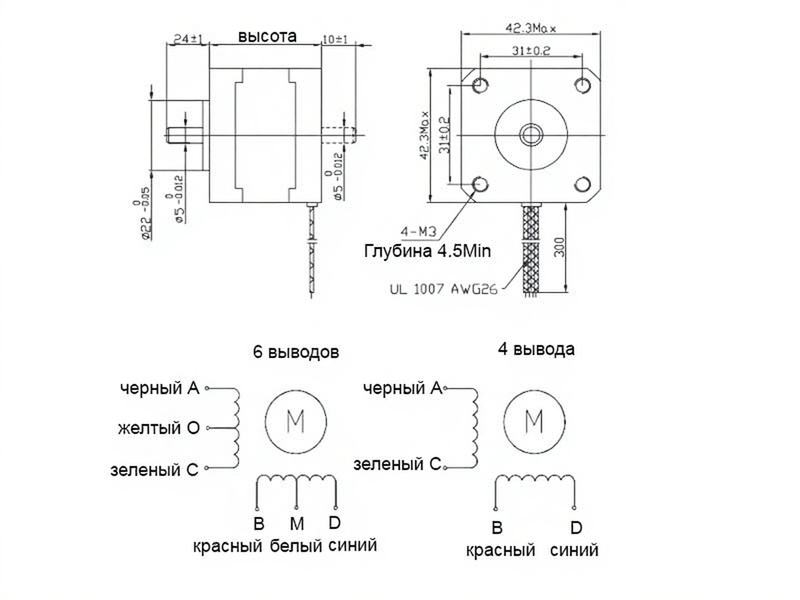 Мотор шаговый Nema 17 (OK42STH47-2304A) двухфазный, биполярный, 4х проводной. Ток фазы: 2.3А. Момент удержания: 4.6 кг/см. Шаг: 1.8°. Размеры: 42х42х47мм