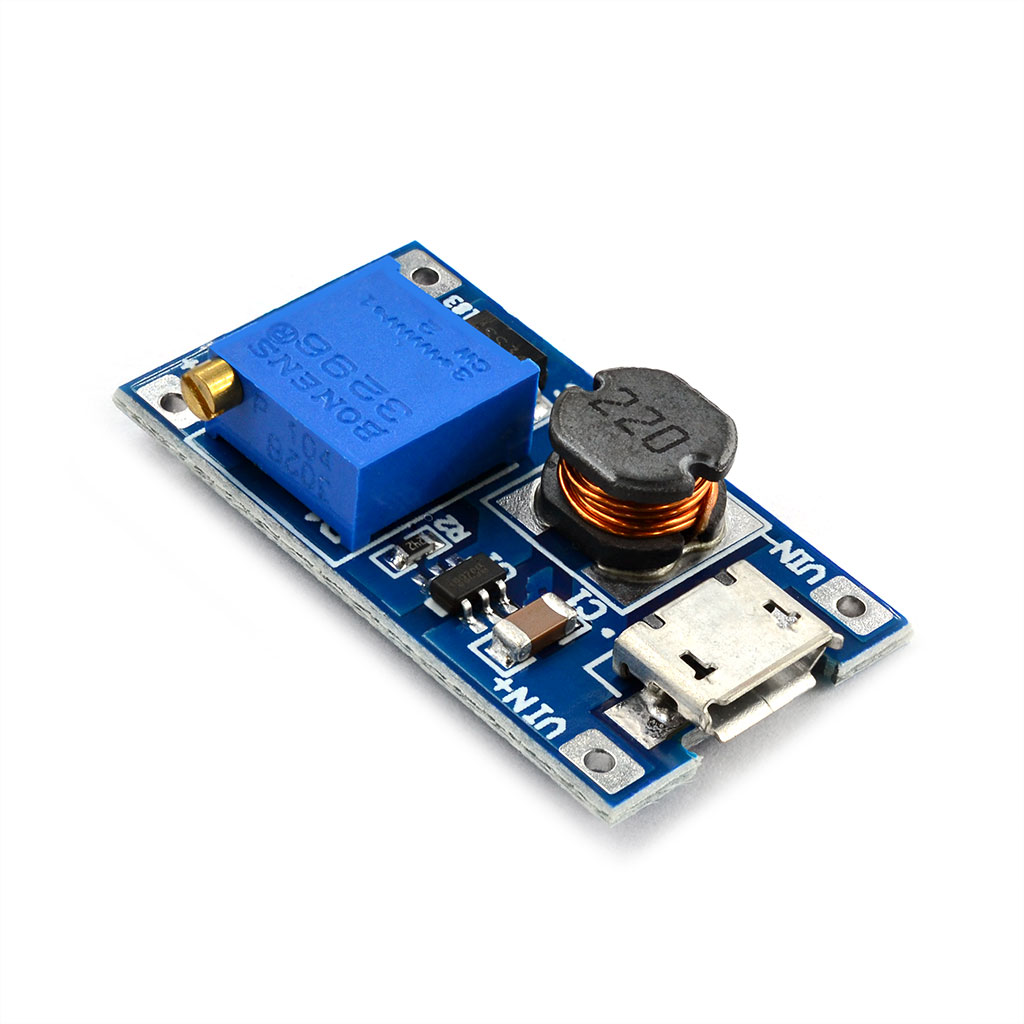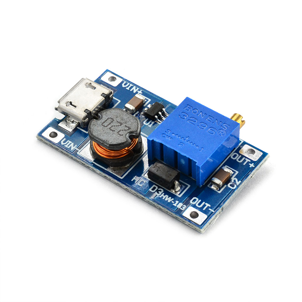 Модуль преобразователя постоянного напряжения HW-183 построен на микросхеме импульсного регулятора MT3608. Основной областью применения преобразователя является питание различных микроэлектронных устройств и перезарядка различных батарей невысокими токами. Преобразователь позволяет повысить входное напряжение в диапазоне 2.0 ~ 24.0 вольт до 28.0 вольт на выходе. Продолжительная работа преобразователя рекомендуется под нагрузками с током до 1А или температуреном нагреве не более +80°C. В иных случаях, для микросхемы MT3608 должно быть организовано дополнительное охлаждение.