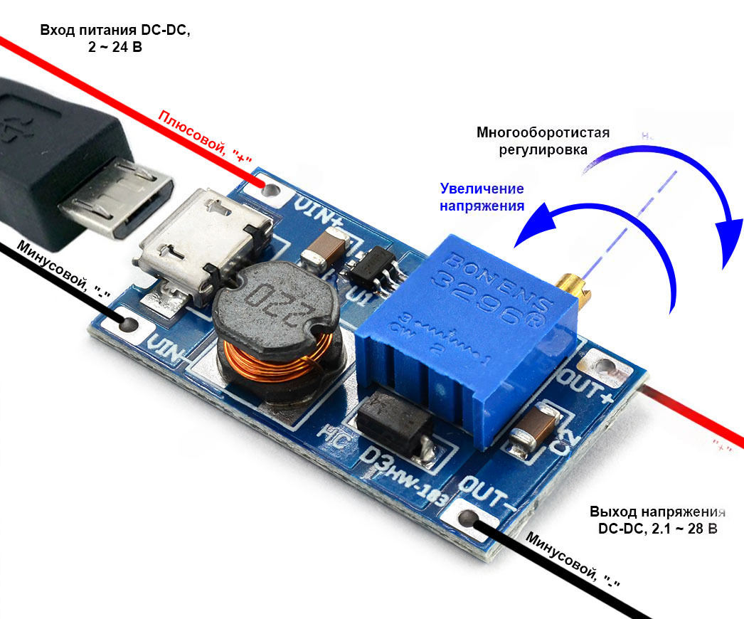 Регулятор MT3608 оснащён 5-вольтовым разъёмом USB Micro-B и площадками под пайку VIN+/VIN-для подключения платы HW-183 к внешнему источнику напряжения. Передача энергии в нагрузочную цепь осуществляется через аналогичные площадки под пайку OUT+/OUT-. Соблюдение полярности подключения является обязательным - защиты от переполюсовки не предусмотрено.