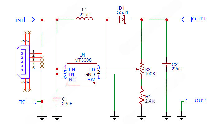 Принципиальная схема модуля повышающего преобразователя на ИС MT3608