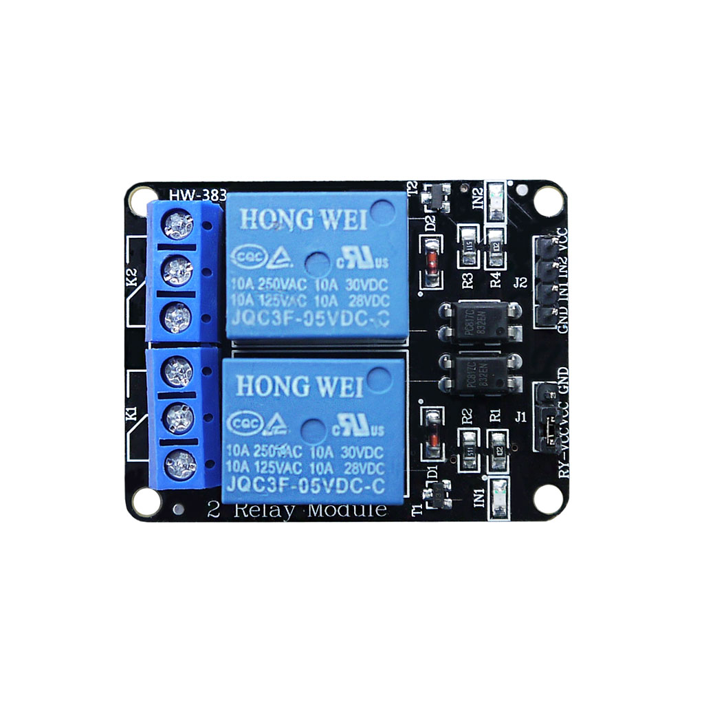 Модуль реле на 2 канала с опторазвязкой. Обеспечивает более защищенное управление нагрузкой. Питание 5 В.