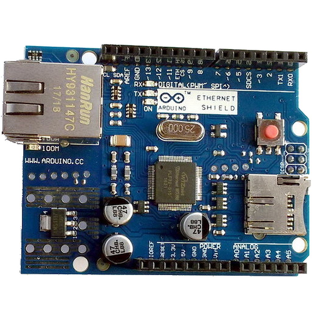 Данная плата расширения базируется на чипе WIZnet Ethernet W5100 и позволяет получить доступ к локальной сети и сети Интернет через стандартный сетевой разъем RJ45. На плате есть разъемы для подключения адаптера PoE, который необходимо приобретать и устанавливать самостоятельно. Поддерживает стандартную библиотеку Ethernet в среде Arduino IDE. На шилде присутствует разъем microSD карты для хранения различных данных и сетевого доступа к ним. Работа с microSD картой возможна с использованием стандартной библиотеки SD. Плата расширения совместима с Arduino UNO, Mega 2560, а также другими совместимыми платами со схожими типоразмерами. В чипе WIZnet W5100 осуществляется аппаратная поддержка стека протоколов TCP/IP. Возможно одновременно до 4 сокет-соединений.