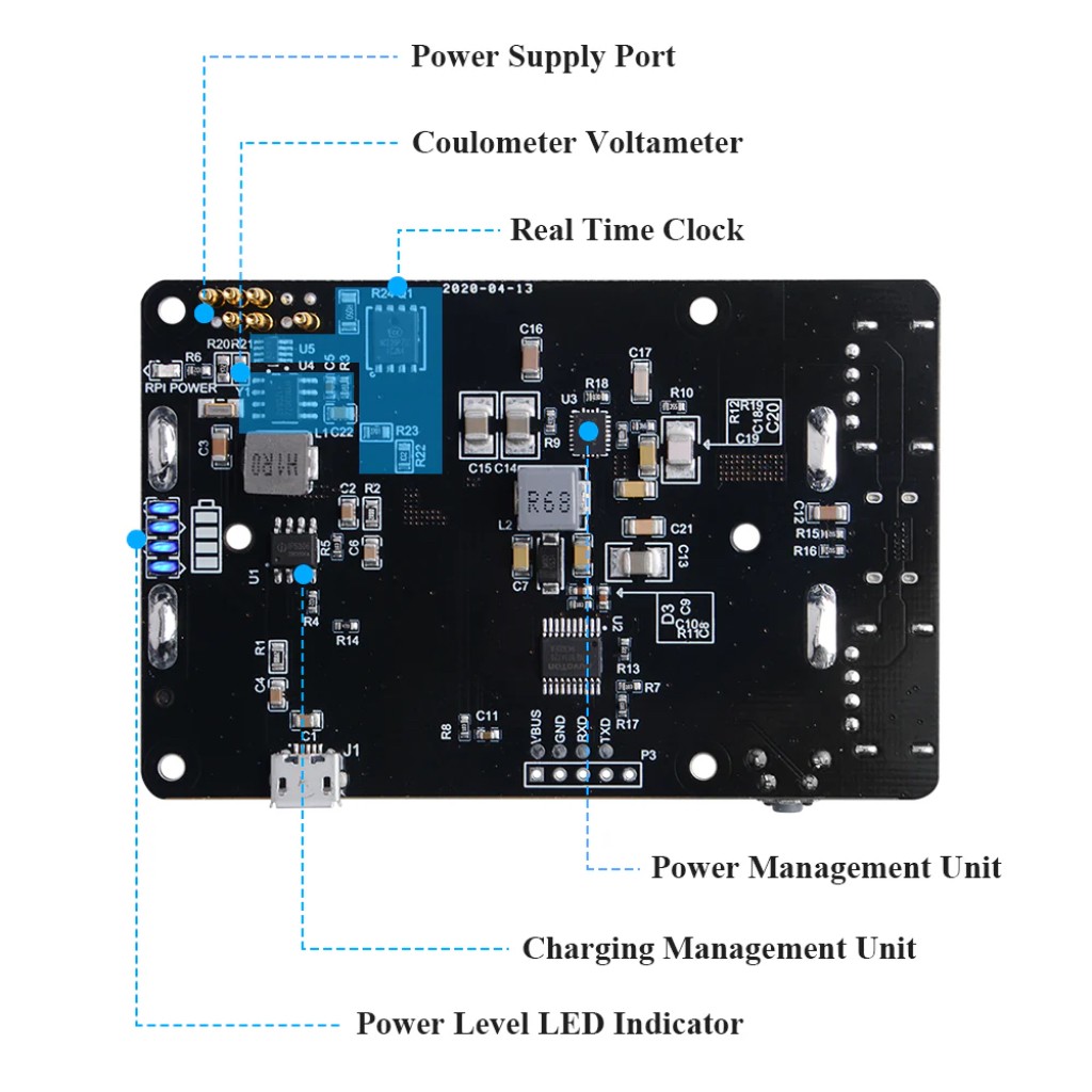 Модуль беcперебойного питания для Raspberry Pi с встроенным RTC. В модуль устанавливаются два аккумулятора Li-Ion ICR18650 (нет в комплекте). Модуль обеспечивает контроль, заряд и разряд установленных аккумуляторов, а так же позволяет программно из ОС сле