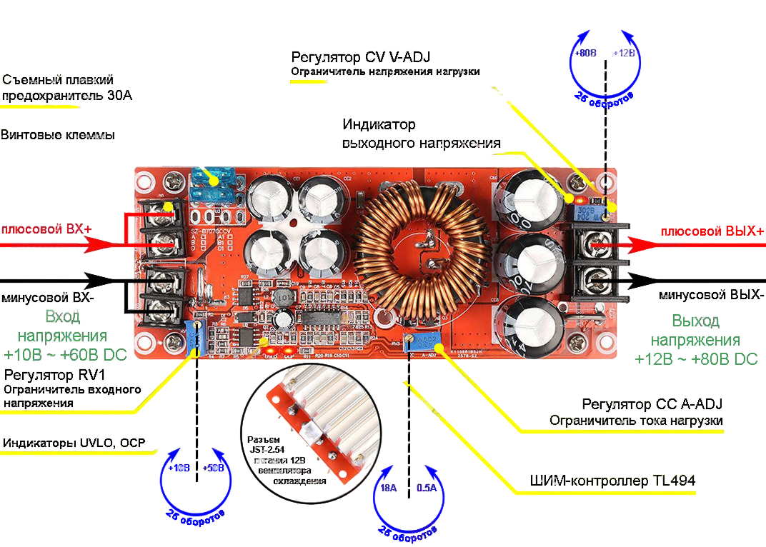 Выбор напряжения и тока - регулятором. Вх.напр.: 12-48В, напр.вых.: 48-72В, Ток макс.: 20А. КПД 98,1%. Оснащен защитой от короткого замыкания, пониженного напряже