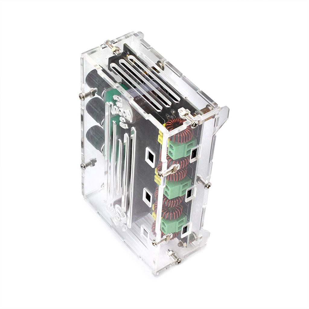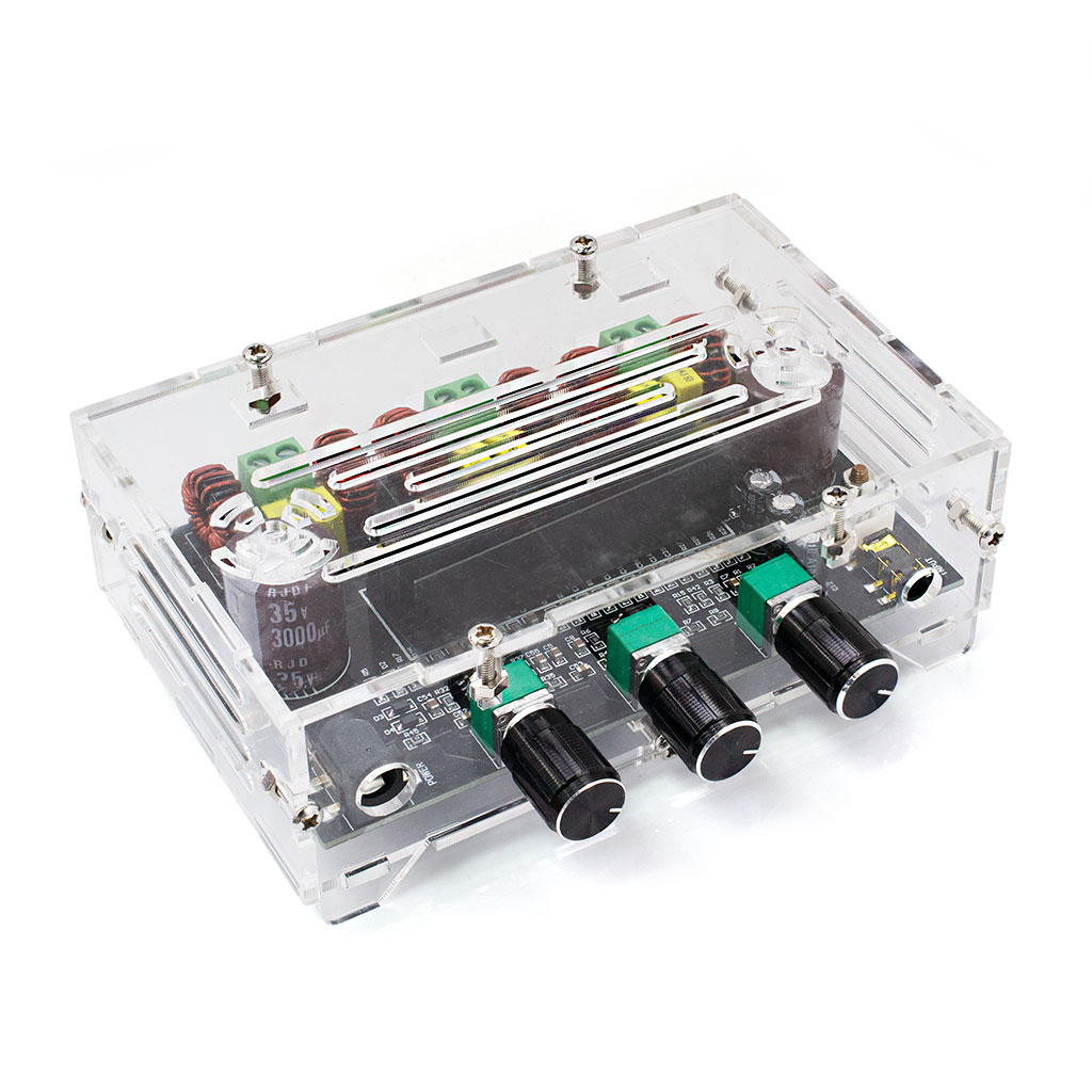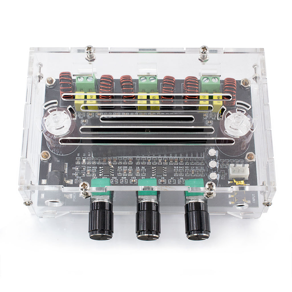 Аудио усилитель стереофонический класса 2.1 с сабвуфером. Питание: 12-26В/3А. Построен на чипах TPA3116D2 и NE5532. Выходная мощность: 2*80+100 Вт. Сопротивление нагрузки: 4-8 Ом. Частотный диапазон: 14 Гц-100 кГц. Отношение сигнал-шум: 100 дБ.Регулировка