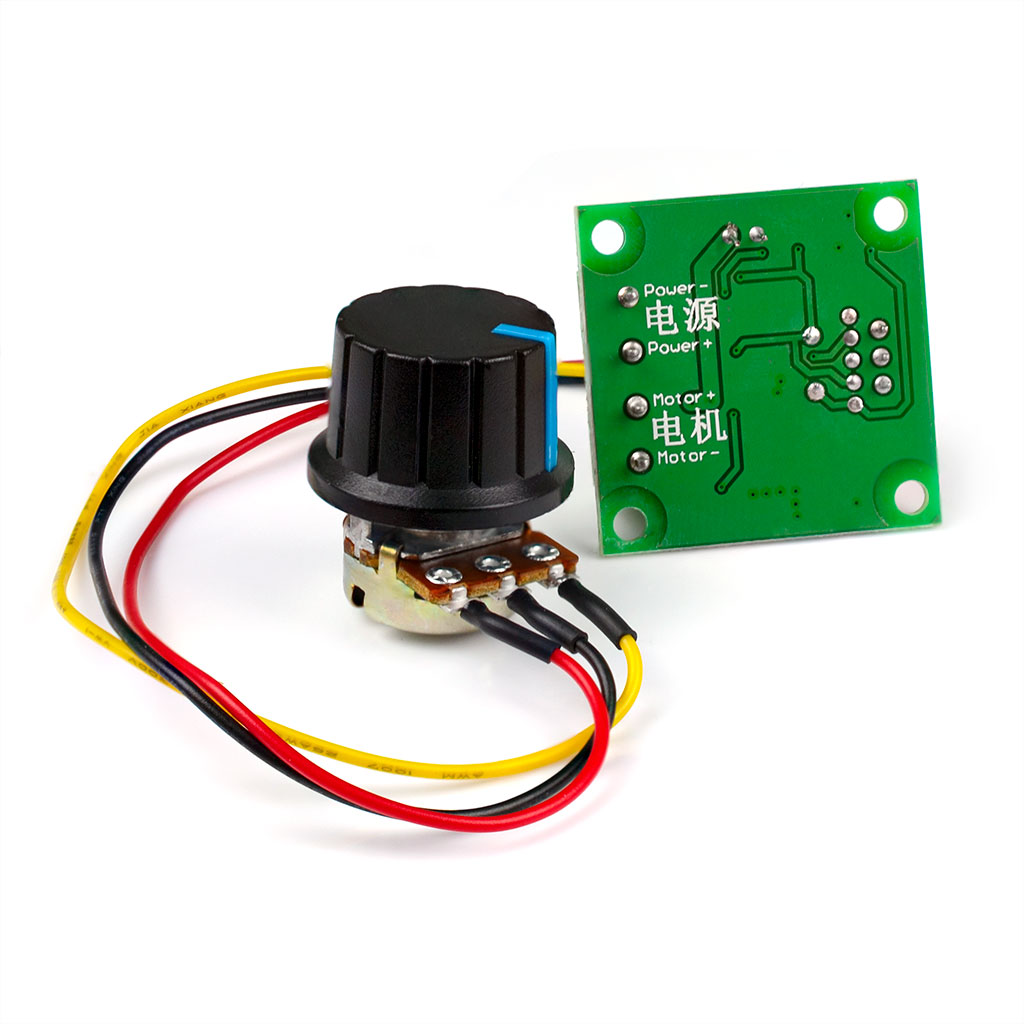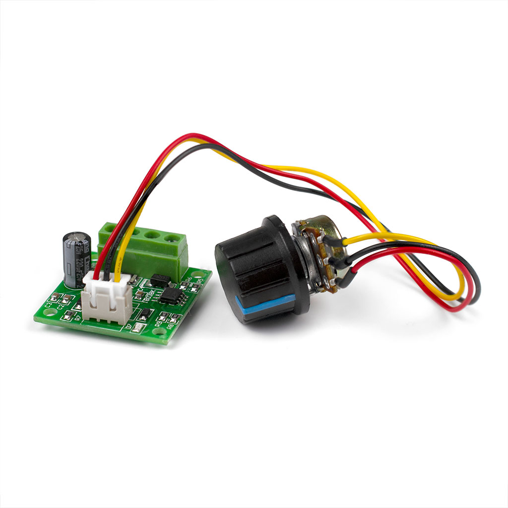 Регулятор оборотов двигателя ШИМ напряжение 1.8-12В ток 2А с ручкой управления на проводе. Сомовосстанавливающийся предохранитель защиты от перегрузки встроен, Размеры: 15*32*51 мм, Вес: 15 г.
