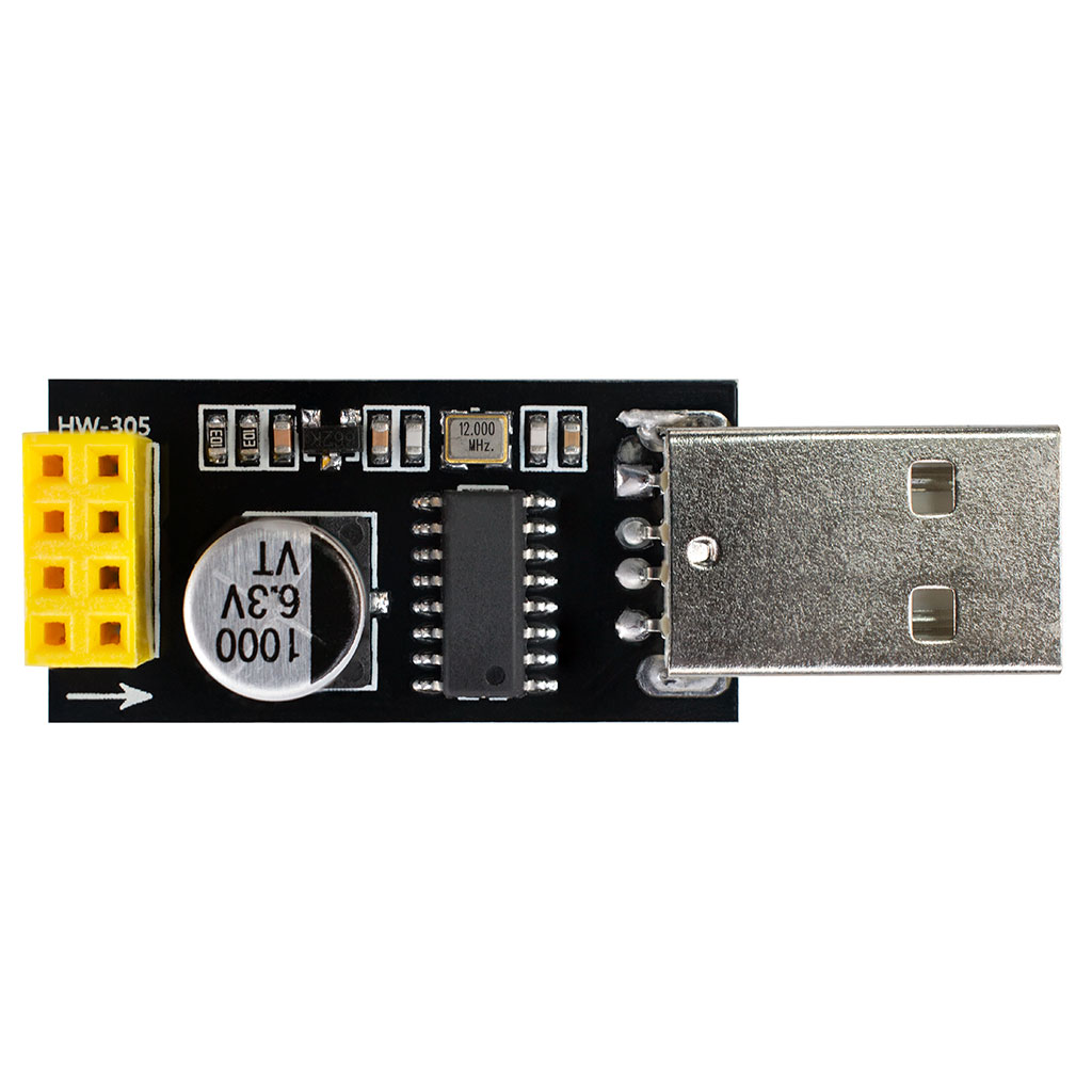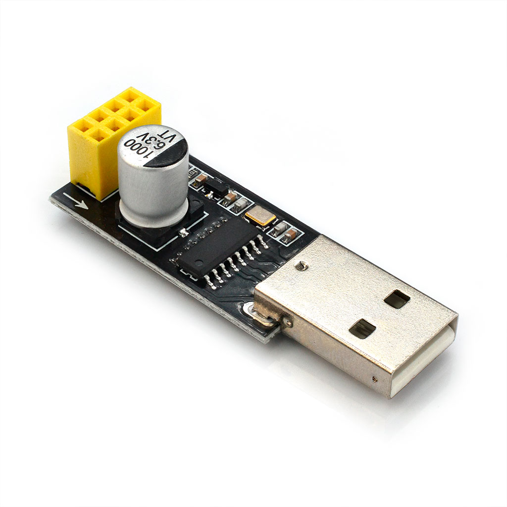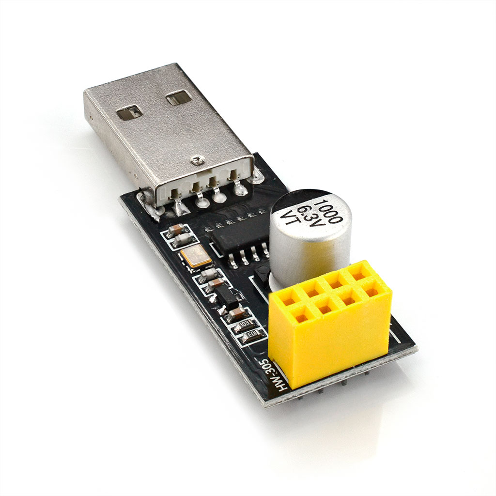 Модуль USB-адаптера для WIFI-контроллера ESP-01 ESP-01S ESP8266. Встроенный преобразователь сигналов USB-TTL-UART на чипе CH340G и регулятор напряжения 3.3В. Режим прошивки ESP8266 не поддерживается. Размеры: 48.8*17*13.6мм. Вес: 5.3гр
