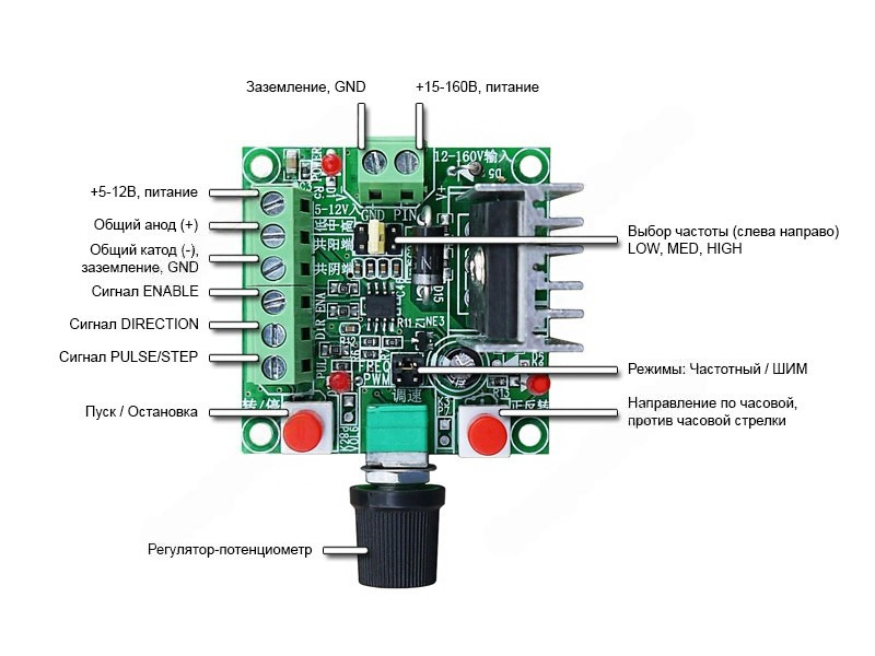 Модуль генератора предоставляет два режима работы: частотно-импульсная модуляция (ЧИМ) и широтно-импульсная модуляция (ШИМ). Предусмотрена настройка частоты генерации импульсов в трёх различных диапазонах LOW (82 Гц - 2.3 кГц), MED (590 Гц - 15.8 кГц), HIGH (5.8 кГц - 127 кГц). Указанные производителем значения частоты приблизительны и могут незначительно отличаться. В режиме ЧИМ, рабочий цикл изменяется поворотом потенциометра по часовой или против часовой стрелки в диапазоне 38-66%, в режиме ШИМ - от 3 до 96%. Для смены режимов работы и выбора требуемой частоты, на плате установлены выводы-перемычки. Модуль допускает подключение драйверов шагового двигателя с оптически развязанными входами управления, соединяемых по схемам с общим анодом или общим катодом. Светодиодная индикация модуля отображает основные функции и наличие напряжения, питающего цепи генератора.