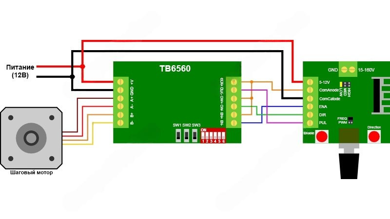 Пример подключения генератора ШИМ/ИМПУЛЬС к драйверу шагового мотора TB6560 по схеме с общим анодом (+):