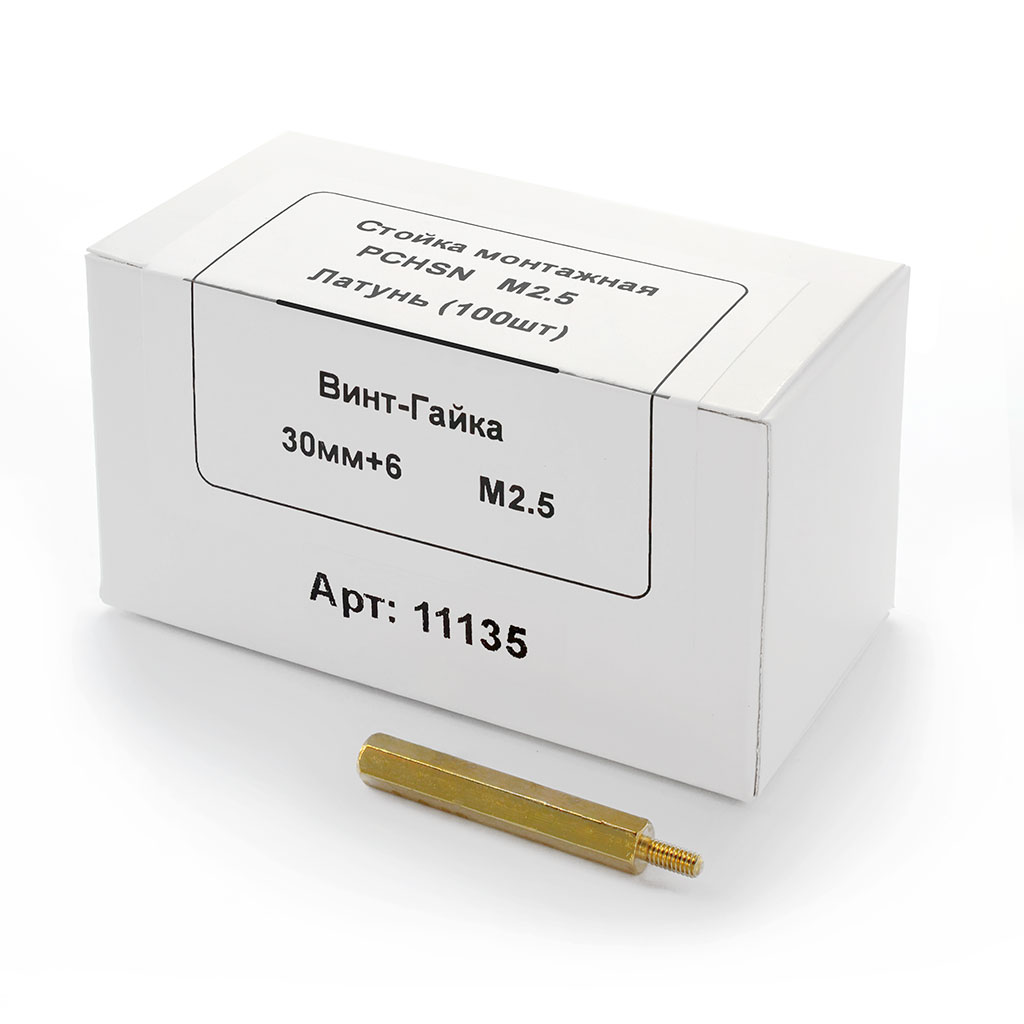 Стойка латунная PCHSN2.5-30. Гайка-Винт. Длина 30 мм. Резьба M2,5х0,45. 100 штук
