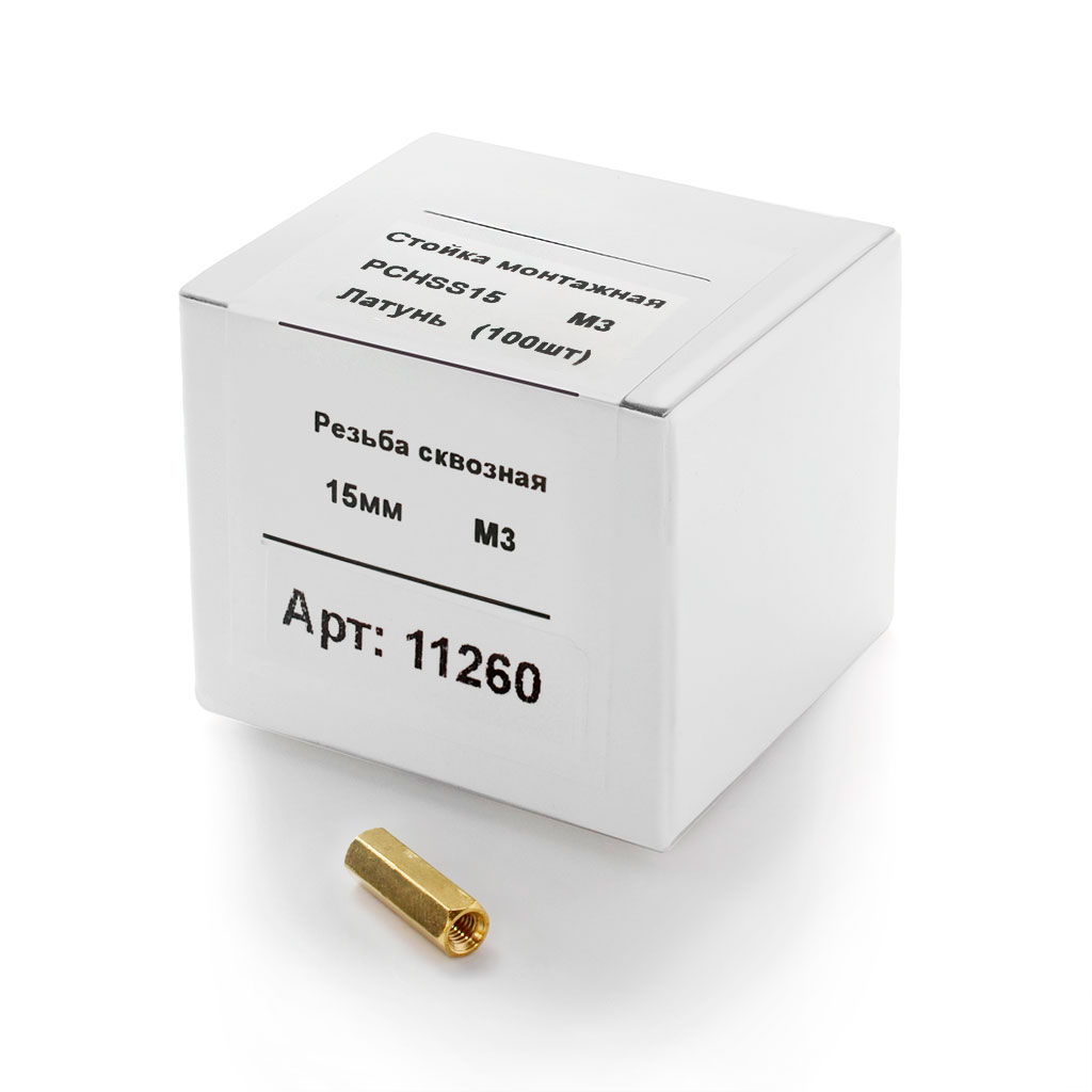 Вы можете купить Стойка латунная PCHSS-15. Гайка-Гайка. Длина 15 мм. Резьба M3х0,5. 100 штук как за наличный расчёт, так и по безналичному расчёту ( т.н. безналу, перечислению).
