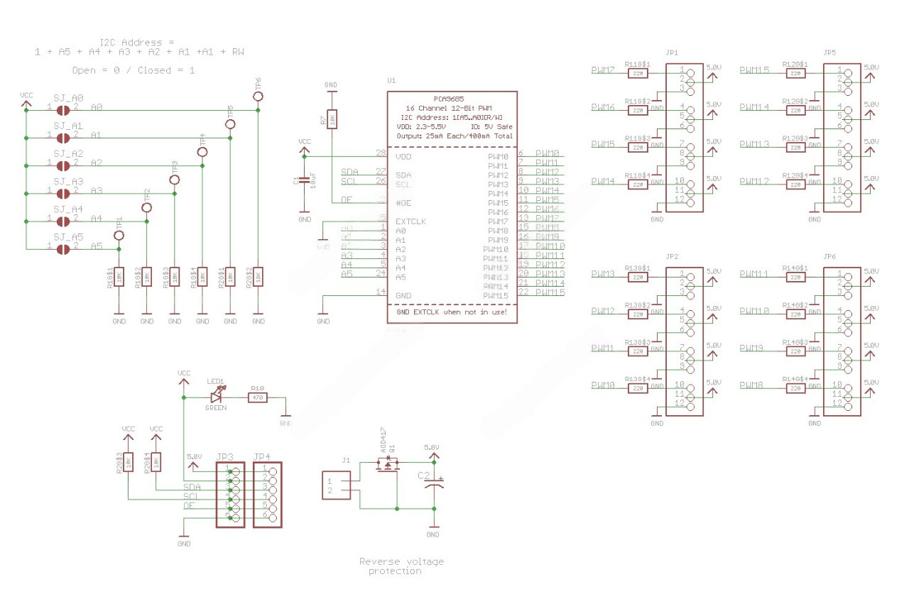 PCA9685 — это 16-ти канальный 12-разрядный контроллер с настраиваемой частотой ШИМ-а в пределах от 24 до 1526 Гц. С помощью ШИМ контроллера можно управлять яркостью светодиодов, сервоприводами, и другими устройствами, где в качестве управляющего сигналы применяется ШИМ сигнал. Для управления PCA9685 используется шина I2C. Использование нескольких плат расширения, подключенных "бутербродом", позволяет расширить количество управляемых устройств. На плате предусмотрены перемычки, с помощью которых можно установить адрес устройства отличный от стандартного (общее количество комбинаций адресов - 62). Таким образом, использование нескольких плат расширения теоретически позволяет управлять 62*16=992 сервоприводами.