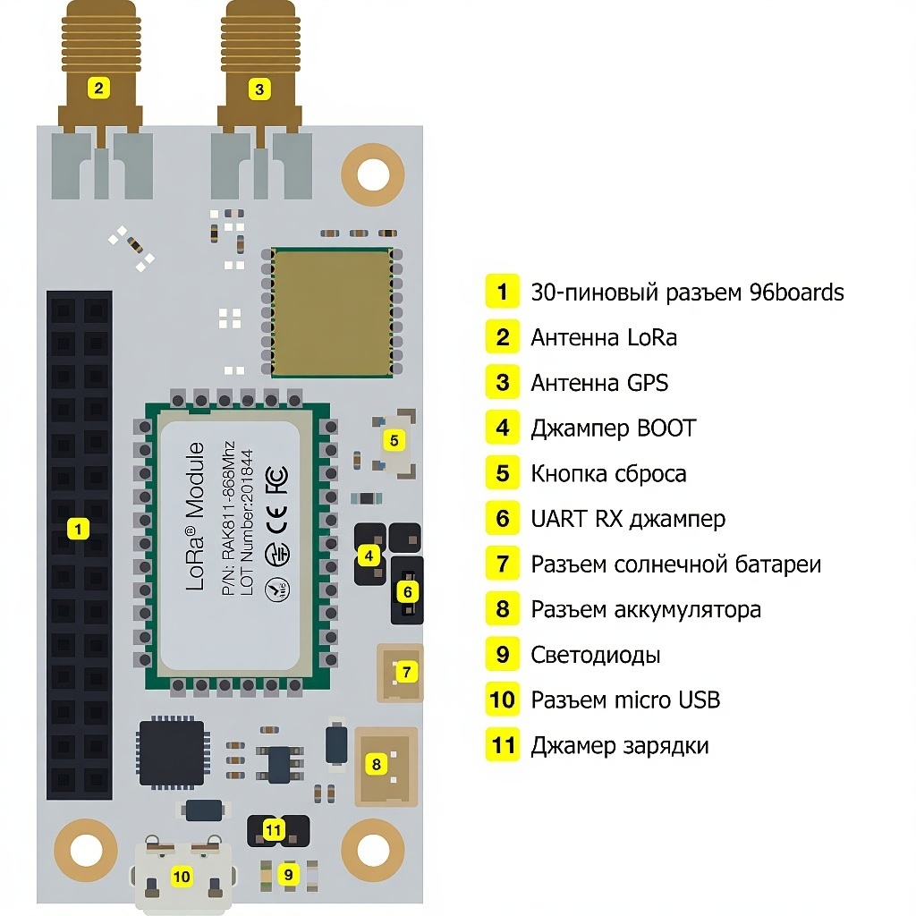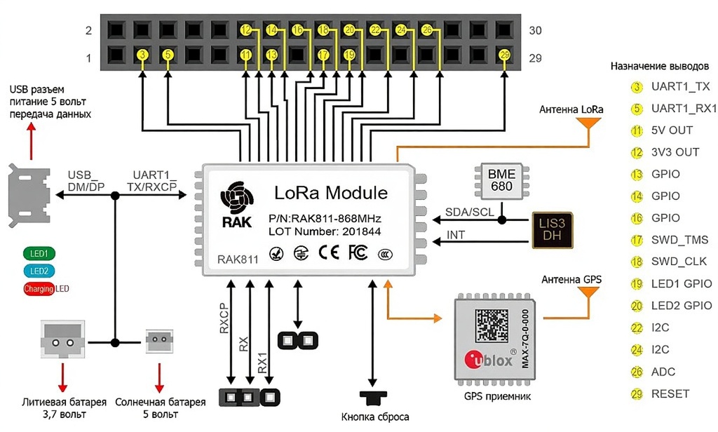 - Разъемы iPEX для антенн LoRa и GPS;