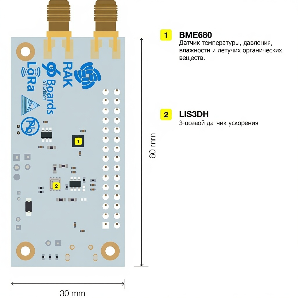 - Встроенные датчик окружающей среды BME680 (органические летучие вещества, давление, влажность, температура) и 3-осевой МЭМС-датчик LIS3DH (акселерометр);