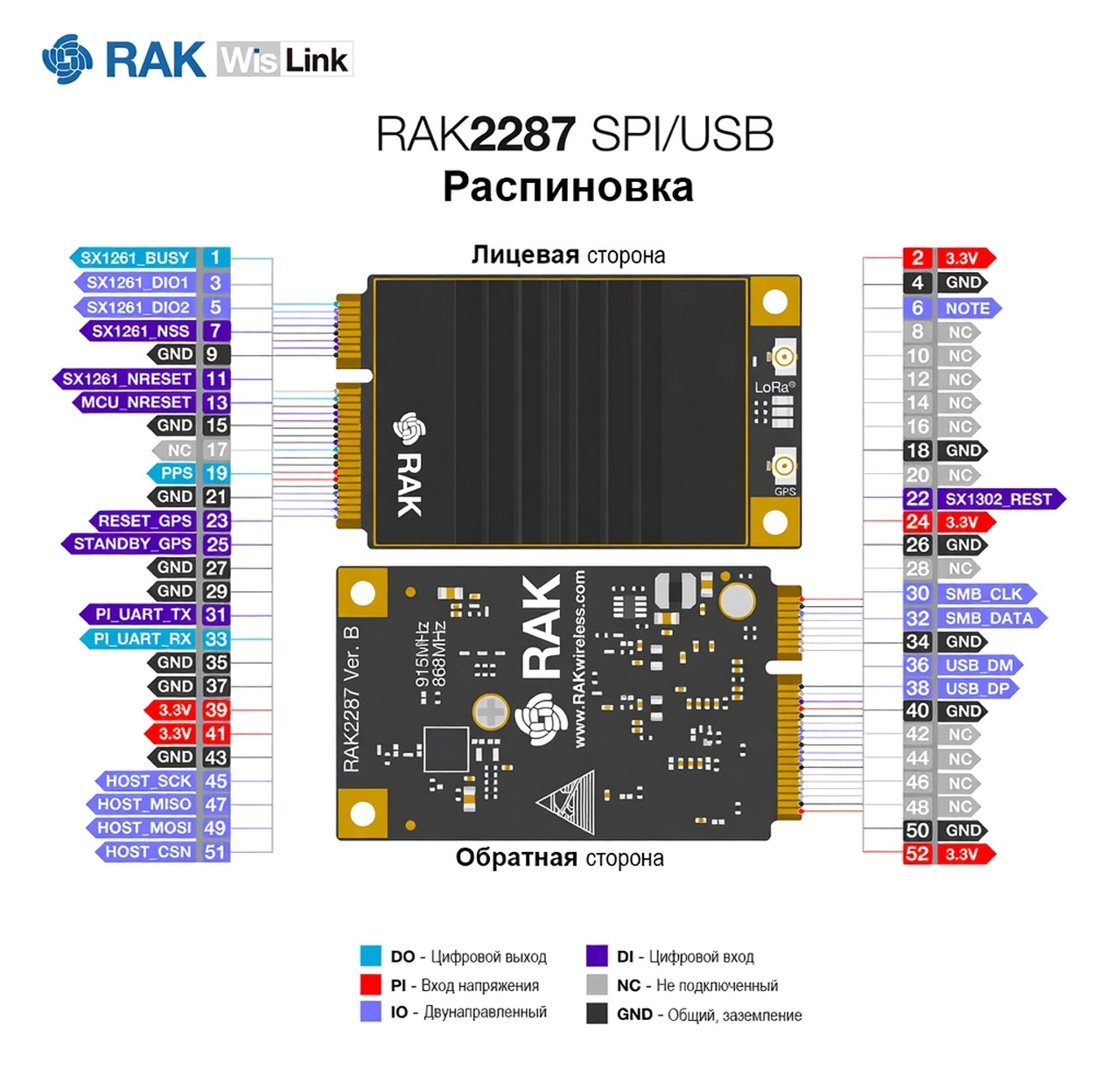 RAK2287-S3 Модуль GPS/LoRa-концентратор. Выполянет роль 8-канального шлюза в сетях LPWAN. Питание: 3.3В. Энергопотребление: 70-513мА. Частотный диапазон: 868 МГц. Интерфейсы: UART, SPI, I2C, GPIO. Разъём подключения: PCI Express Mini Card 1.2. В комплекте