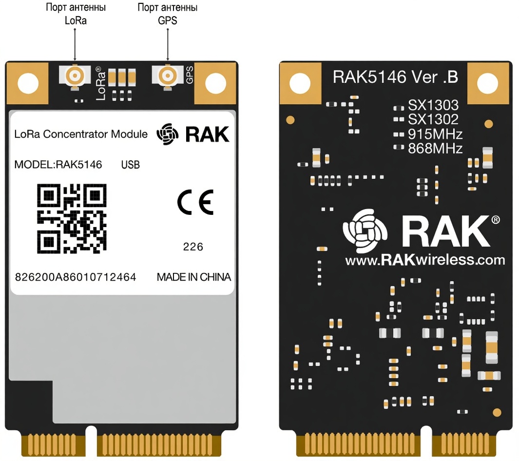 Модуль многоканальной базовой станции RAK5146 для сетей LPWAN собран на обновлённом поколении радиочастотных сигнальных чипов Semtech SX1303. Выбранный производителем в качестве основы, чип SX1303, также как и предшественник SX1302, обрабатывает б?льший объём трафика, работает на пониженном энергопотреблении и имеет меньшее тепловыделение (в отличии от аналогов Semtech SX1301 и Semtech SX1308). Модуль RAK5146 предоставляет возможность быстрой и лёгкой интеграции полноценного аппаратного шлюза LPWAN не только в существующие модели маршрутизаторов, но и в любое другое сетевое оборудование, совместимое с технологией LoRa. RAK5146 спроектирован в современном компактном формате Mini PCIe, благодаря которому модуль может быть установлен в любые встраиваемые системы, оснащённые соответствующим слотом mini-PCIe, и поддерживающие обмен данными по универсальному последовательному интерфейсу USB. В дополнение к главному LPWAN-функционалу, в схему RAK5146 добавлен чип приёмника U-blox ZOE-M8Q GPS, расширяющий возможности модуля функционалом глобального спутникового позиционирования GNSS.