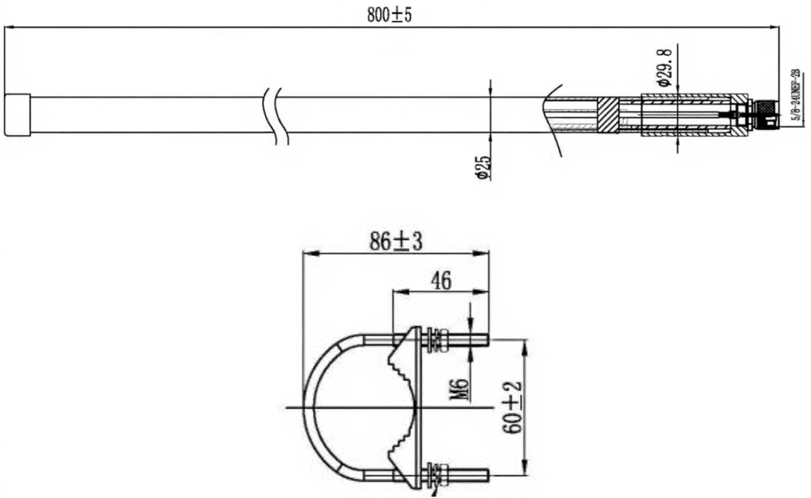Жёсткая съёмная вертикальная антенна второго поколения, предназначенная для устройств со встроенным приёмо-передатчиком LoRa, транслирующего радиосигналы в диапазоне безлицензионных частот 433 МГц. Антенна обладает коэффициентом усиления сигнала с максимальным значением 5.8 дБи. Выполнена в корпусе из прочного стекловолоконного материала белого или чёрного цвета. Применяемый в конструкции материал стекловолокна устойчив к ультрафиолетовому излучению и защищает излучатель антенны от естественных разрушающих погодных факторов, таких как сильный ветер, мощный ливень или град, обледенение. Основание антенны оснащено высокочастотным соединительным разъёмом типа N (N-type), допускающим прямое подключение к приёмопередатчику, через фидерную линию, или к адаптеру с другим РЧ-интерфейсом. Стекловолоконная монопольная антенна всенаправленного излучения комплектуется проводным переходником "гнездо N-типа в SMA", длина соединительного шнура которого составляет около 1 метра. Пара монтажных U-образных кронштейнов позволяют закрепить антенну в горизонтальном или вертикальном положении, а также под любым другим эффективным углом.