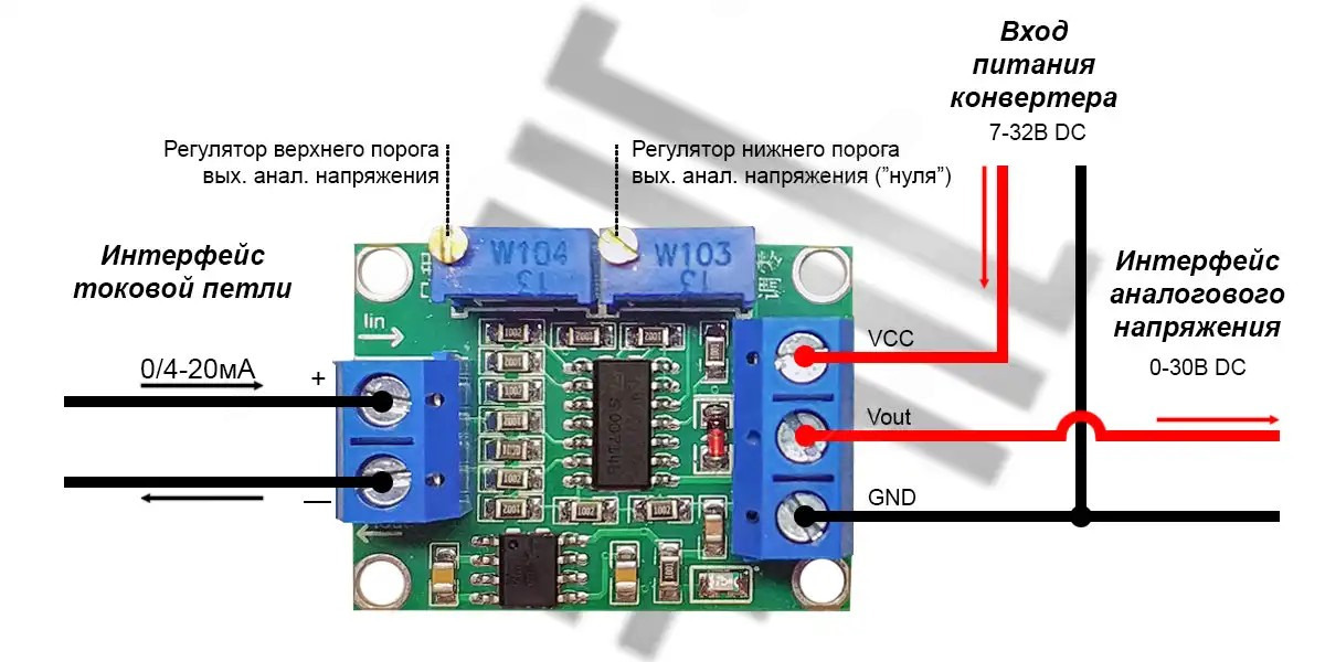 Настройка преобразователя требует подключения двух источников: сигнала токовой петли 0/4-20мА с напряжением от 7 до 32В и питания схемы модуля 7-32В DC. Использование напряжения от линии токовой петли для питания модуля конвертера нежелательно, так как это может наложить искажения на точность преобразования. Регулировка параметров выходного аналогового напряжения осуществляется двумя высокочувствительными потенциометрами.