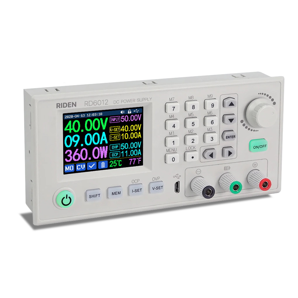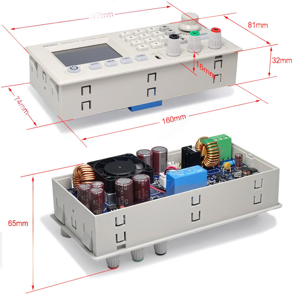 Цифровой програмируемый DC/DC пониж.преобразов.напряж. RUIDENG RD6012W. Вх.напр.6-70В. Вых.напр.0-60В. Ток.нагр.0-12А. Мощность макс.720Вт. Экран 2.4" цветной LCD HD. Разрядность вольтметра/амперметра: 4 знака. Регулировка напряжения и тока, измерение зар