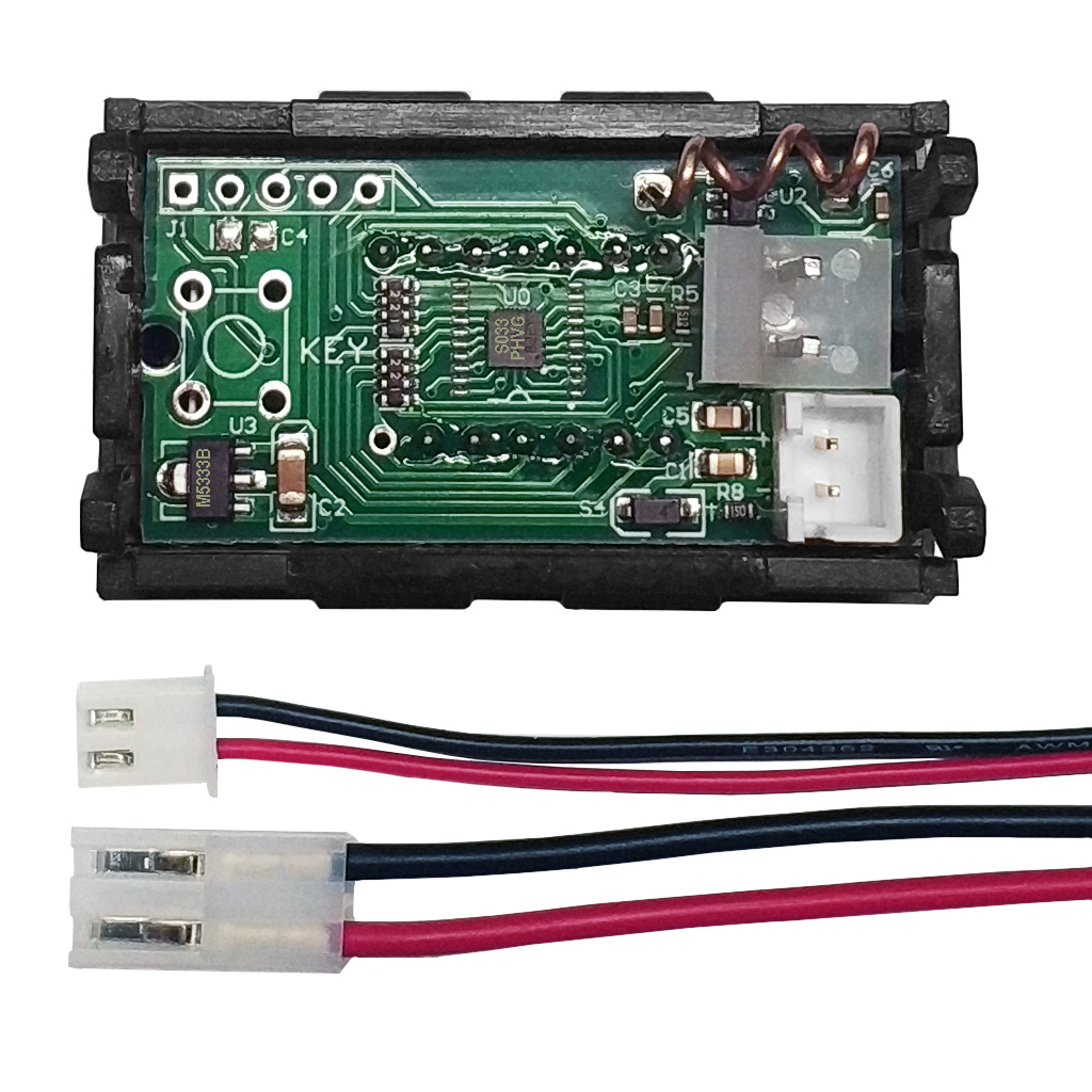 Четырёхпроводная схема подключения позволяет запитывать плату цифрового измерительного прибора как от независимого источника напряжения 3.5-30В DC, целиком изолированного от нагрузки, так и напрямую от напряжения измеряемого контура. Метод раздельного питания в измерительных приборах способствует достижению максимально возможной точности конечных результатов. На обратной стороне устройства распаяны малый 2-пиновый разъём питания внутренней логики устройства и крупный 2-контактный разъём токоизмерительного входа амперметра.