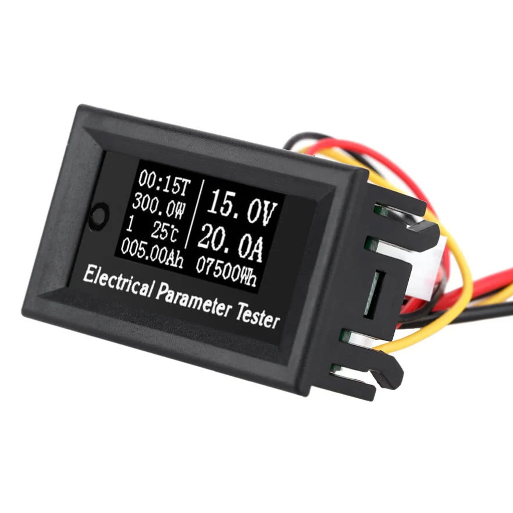 Дизайн миниатюрного прибора легко узнаваем. Корпус внешне похож на встраиваемый символьный вольтметр-амперметр с привычным красно-сине-зелёным светодиодным индикатором, весьма популярным среди радиолюбителей в сегменте бюджетного измерительного оборудования. Внутри помещается полноценный многофункциональный комбайн, объединяющий функции определения уровня напряжения в диапазоне 0-100В, величины силы постоянного тока в первом диапазоне от 0 до 100А и втором от 0 до 50А (устанавливается в соответствии с техническимим параметрами используемого шунта), протекающего по замкнутой цепи, температуры окружающей среды в интервале -15°C ~ +60°C по данным встроенного NTC-термодатчика, подсчёта продолжительности времени до 99 часов 59 минут с момента включения питания, расчёта электрической мощности 0 ~ 5000 Вт (9999 Вт), электрического заряда 0-9999.9 Ач, и накопленной электроэнергии 0-99999 Вт*ч. Мультитестер оснащён ярким монохромным OLED ЖК-экраном с белыми символами на чёрном фоне. Весь объём динамично обновляемой информации с перечисленными характеристиками обрабатывается мощным 8-битным интегрированным процессором семейства STM8, и выводится на персональный 1.05-дюймовый экран в удобочитаемом формате. Ruideng Riden 100V50-100A обладает высокой степенью точности измерений значений электрических характеристик. Коэффициент существующих отклонений показаний не превышает порог ±1%, приравнивая мультитестер к классу полупрофессиональных диагностических приборов.