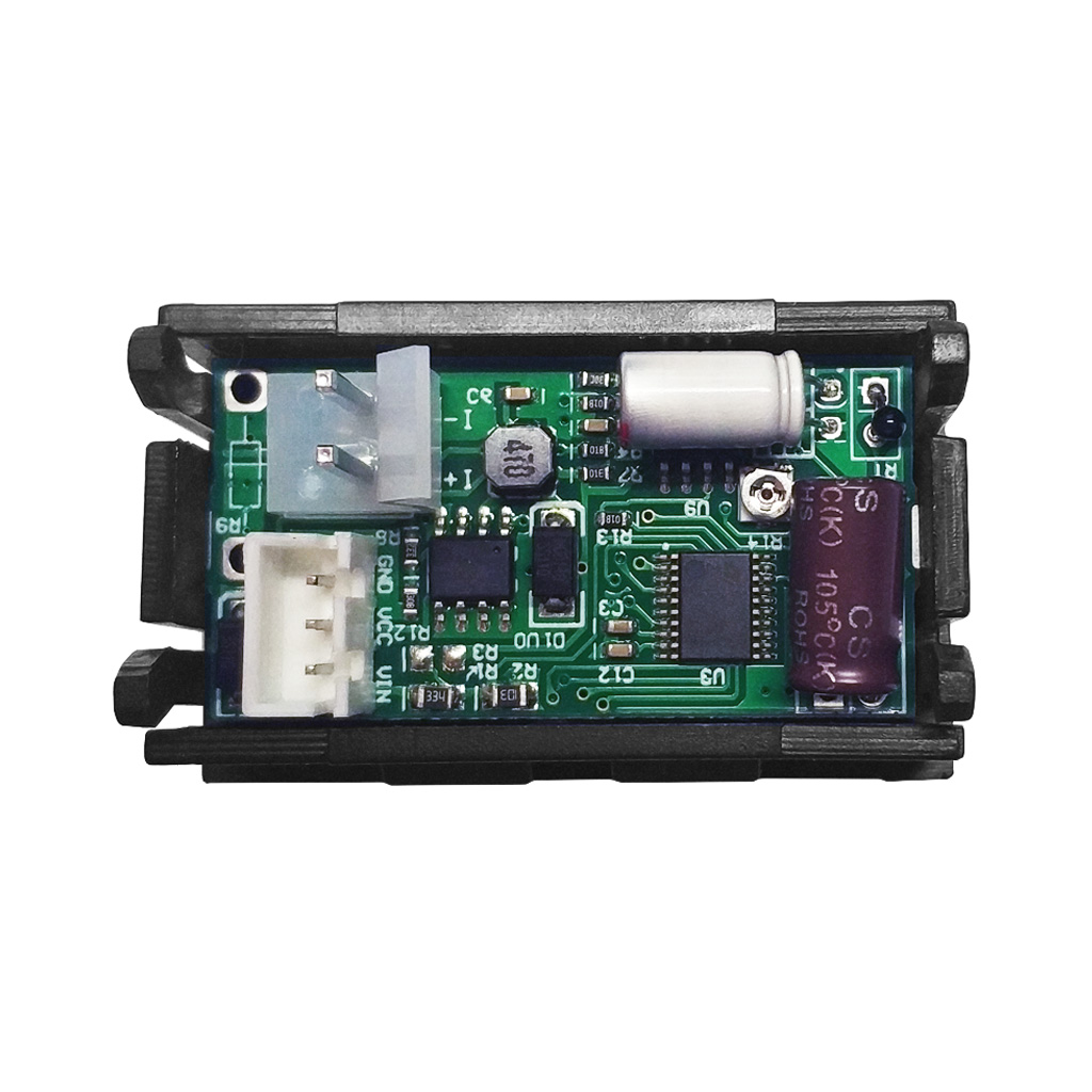 Контуры измерения электрических параметров внешней цепи и питания логики во внутренней схеме мультитестера Ruideng Riden 100V50-100A разделены между собой. Метод раздельного питания в измерительных приборах способствует достижению максимальной точности конечных результатов. Малый трёконтактный разъём сочетает вход рабочего напряжения тестера 5-60В DC и линии подключения вольтметра к цепи исследуемого напряжения. На чуть более крупном двухполюсном разъёме расположены плюсовая и минусовая линии подключения амперметра.