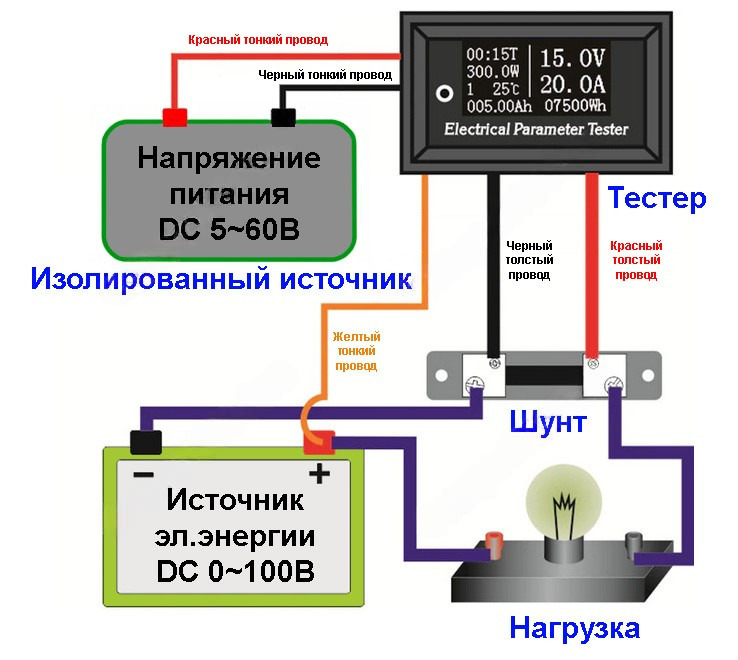 Схема подключения тестера Riden 100V50A-100 OLED с отдельным источником питания в измерительную цепь