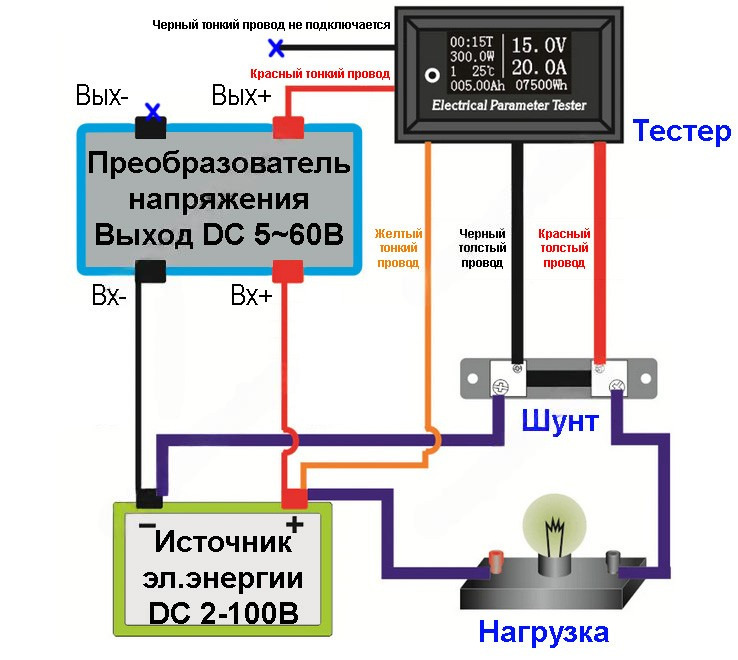 Схема подключения тестера Riden 100V50-100A OLED через регулируемый DC-DC преобразователь в измерительную цепь c одним источником питания