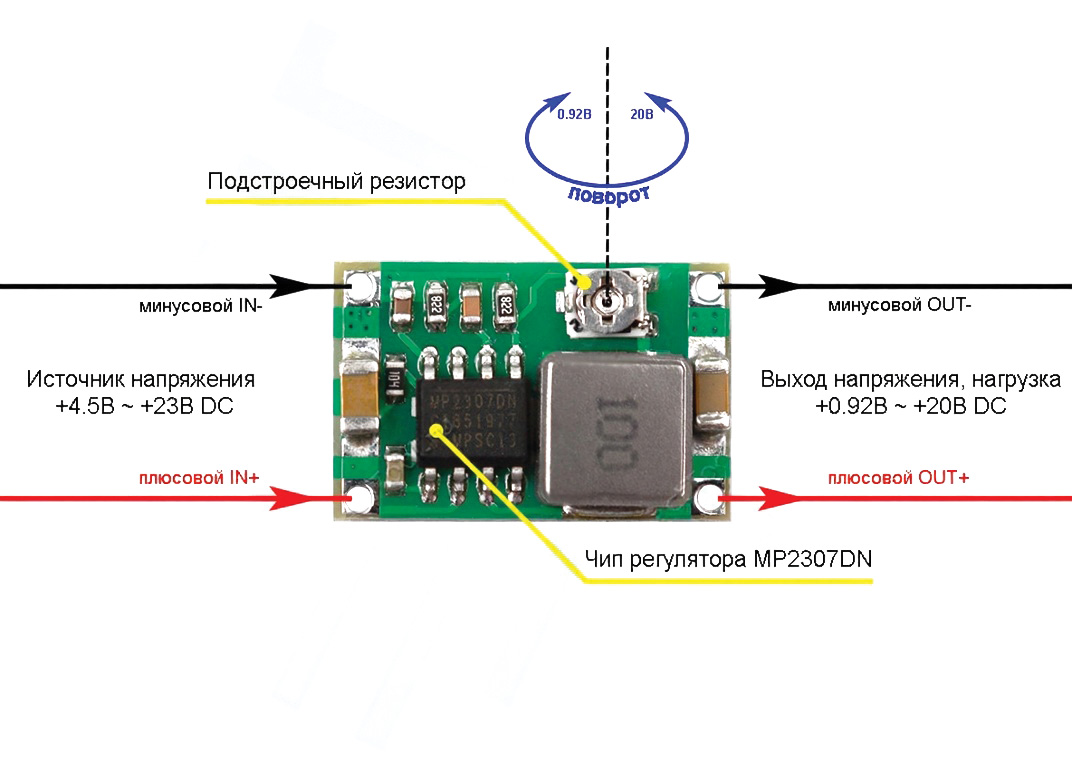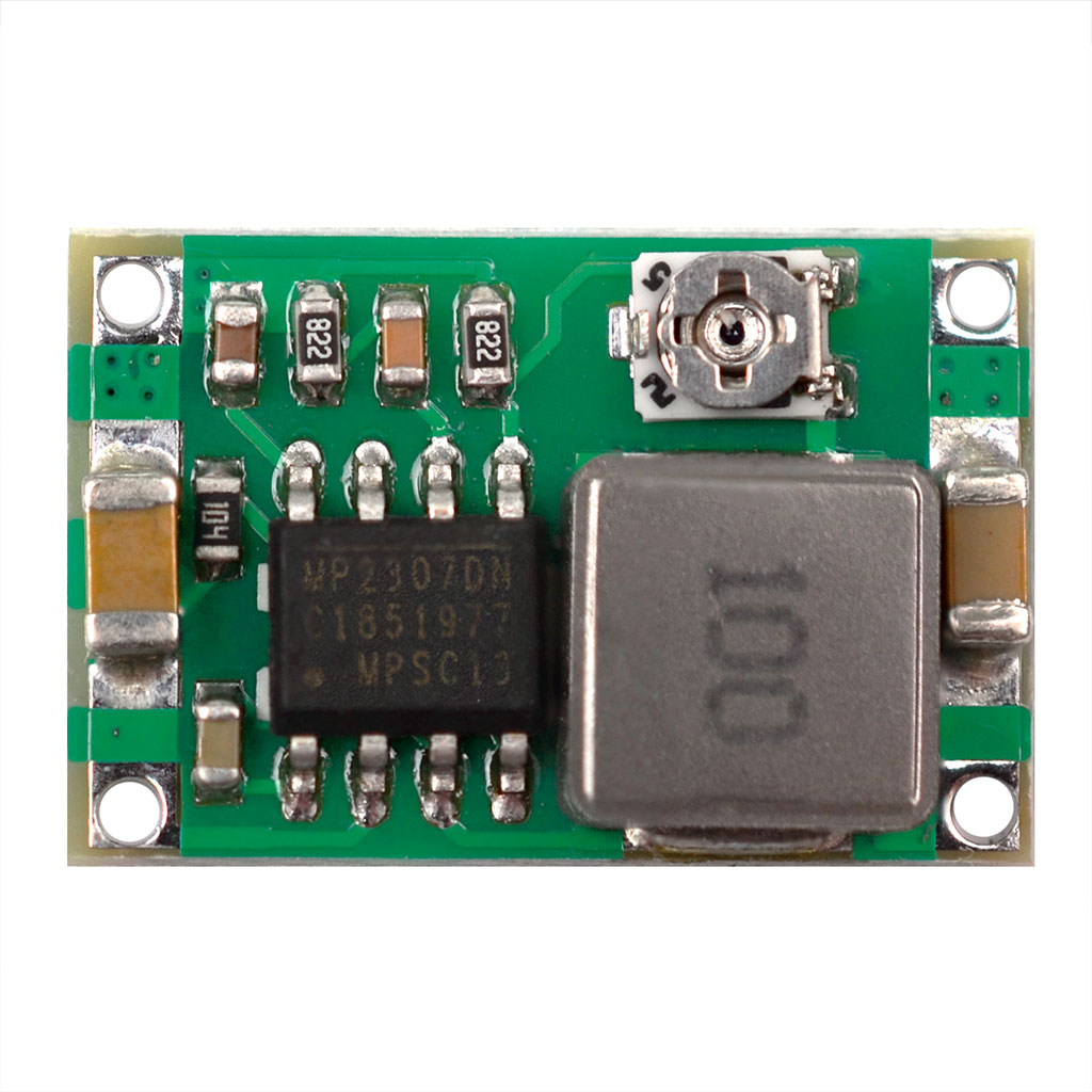 Преобразователь постоянного напряжения DC-DC HW-187 на чипе MP2307DN, понижающий, миниатюрный. Напряжение на входе 4.5-23В, напряжение на выходе 1-20В. Ток: продолжительный 1.5А, пиковый 3А. Регулирировка подстроечником. КПД до 96%. Частота переключения: