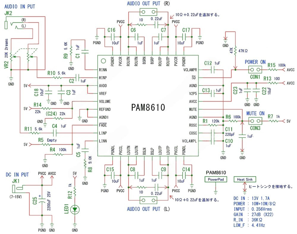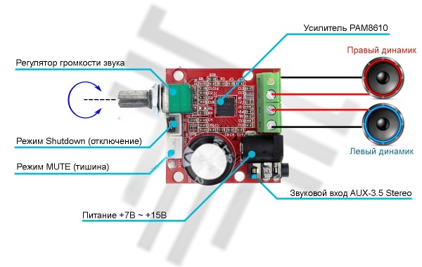 Стерео аудио усилитель мощности PAM8610 — это небольшой оконечный усилитель сигнала звуковой частоты класса D, с выходной мощностью по 15 Вт на каждый канал и низким уровнем шума. Усилитель построен на базе чипа PAM8610, который отличается высокой производительностью, малыми габаритами, наличием системы подавления шумов и защиты от перегрева, и короткого замыкания. Данные чипы используются в современных плоских телевизорах, акустических системах, DVD-плеерах, игровых приставках и т.д. Выход усилителя подключается непосредственно к колонкам для воспроизведения звука.