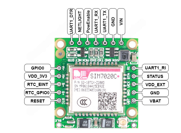 SIM7020C модуль беспроводной передачи данных по стандарту NB-Iot через SIM карту мобильной связи. Выводов для разработки : 17 dip, слот сим карты: MicroSIM, логика: TTL 3.3В, питание: 5-16 В, размеры: 28*26*13мм
